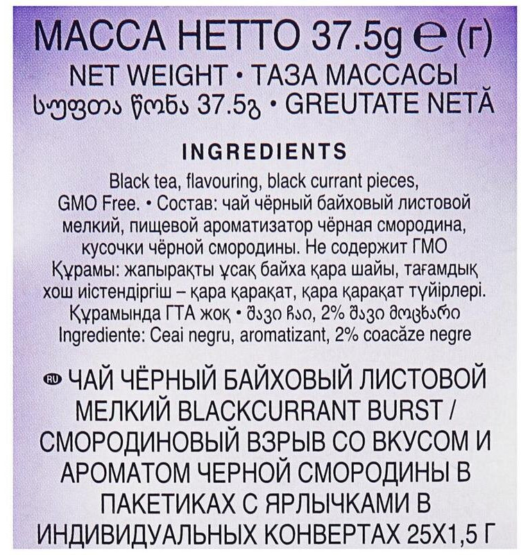 Новинка в ассортименте Ahmad Tea — чёрный чай со вкусом чёрной смородины. Купаж изумительных чёрных чаёв, насыщенных ароматом и кислинкой чёрной смородины. Blackcurrant Burst — сладкий вкус и богатый аромат летнего сада, искренность и свобода самовыражения. |