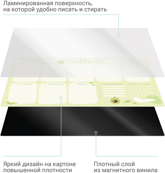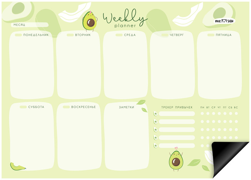 Meshu Планер магнитный с маркером «Avocado»В данный момент этот товар отсутствует в продаже. Возможно, у нас найдется аналогичный или похожий товар здесь. Магнитный планер на неделю MESHU Avocado — отличный помощник в планировании времени. Планер формата А4 выполнен из картона плотностью 200 г/м2, покрытого магнитным винилом. Ламинация позволяет многократно писать и стирать надписи. В комплекте прилагается маркер на магните со стирателем, которым очень удобно корректировать записи и крепить его к любой металлической поверхности (например, к холодильнику). Внимание! Используйте только маркер на водной основе. Для очистки поверхности используйте влажную салфетку. Планер выполнен в универсальном оригинальном дизайне. Он поможет запомнить задачи, спланировать расписание и встречи с коллегами, друзьями или семьёй. Трекер привычек позволит вам добиться успехов в любых начинаниях: бегать по утрам, раньше вставать или ложиться спать и правильно питаться. |