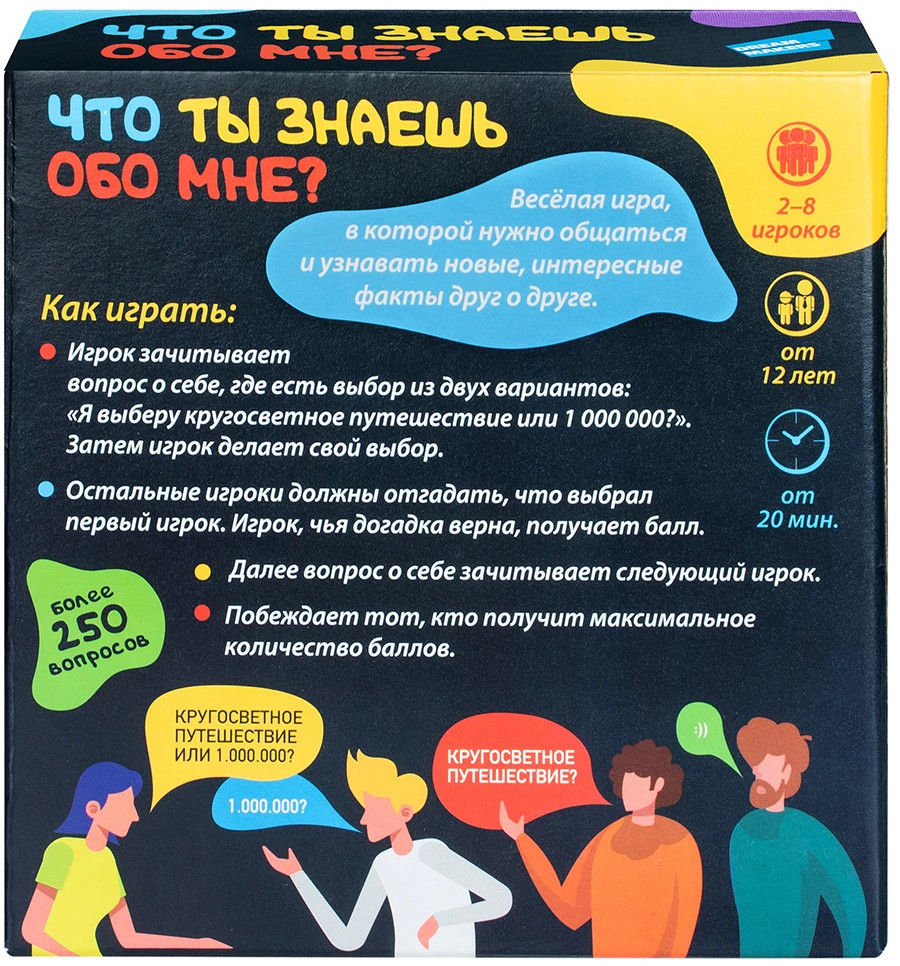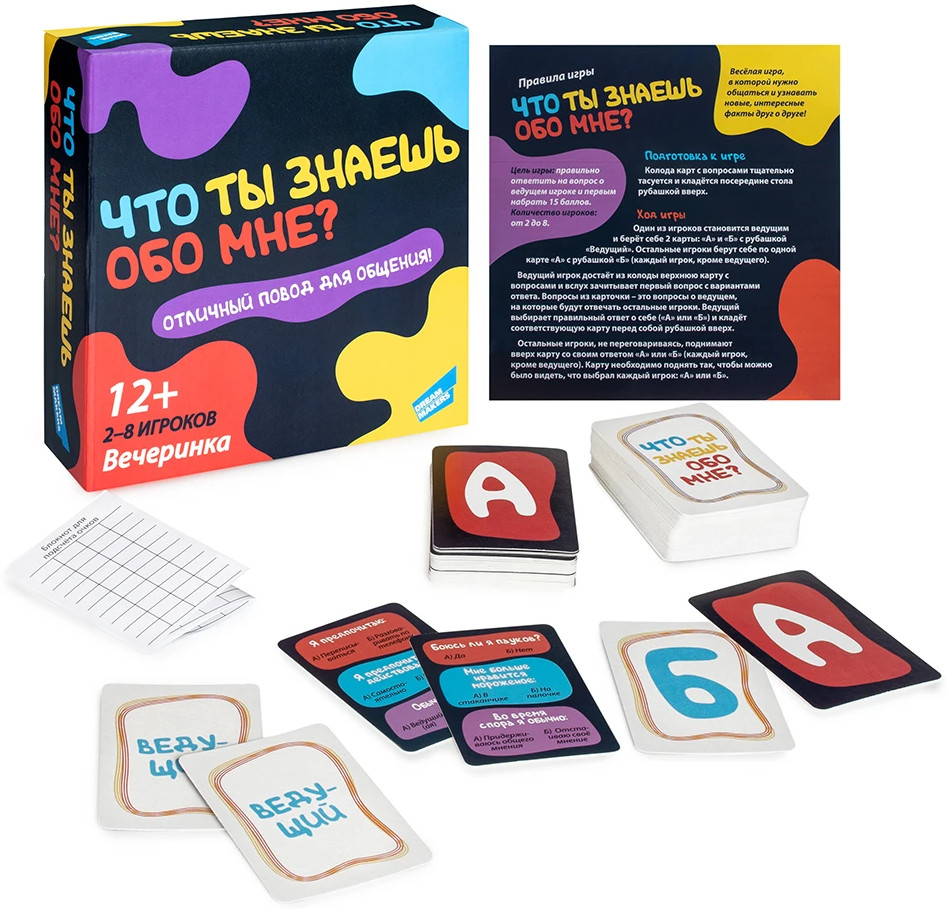 «Что ты знаешь обо мне?» — это весёлая игра, в которой нужно общаться и узнавать новые, интересные факты друг о друге. В игре вы найдёте более 250 весёлых вопросов, которые сделают вашу вечеринку еще ярче. |