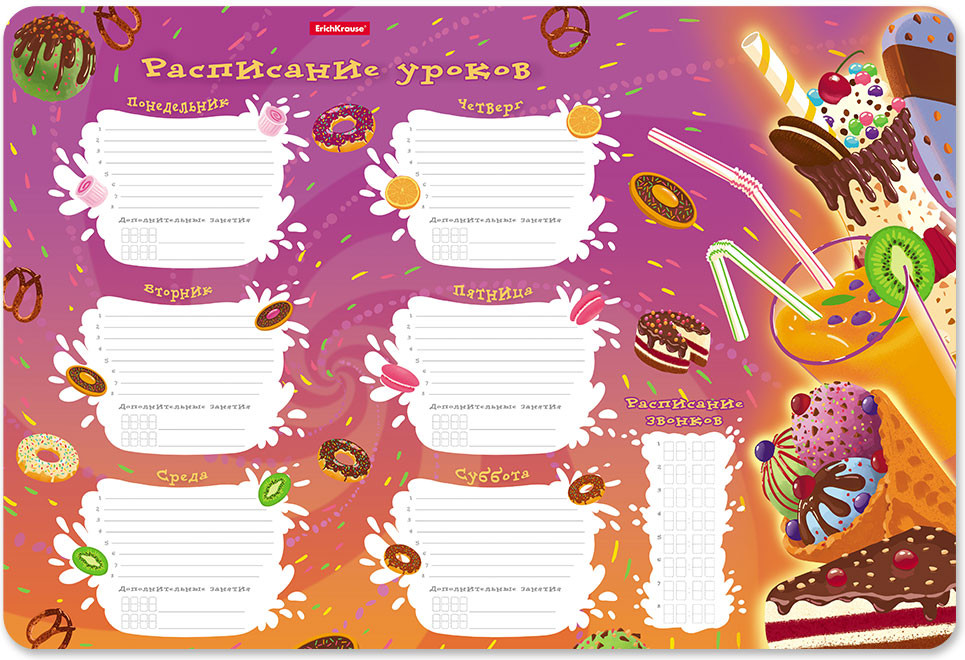 💳 Оплатить за товар можно при получении 🇰🇿 Есть бесплатная доставка по Казахстану от 1 дня 🎁 Копите бонусы с каждой покупки Серия: Сладости Расписание уроков формата А3 из высококачественного пластика. Поверхность подходит для многократного написания простыми и цветными карандашами, фломастерами, любыми не перманентными маркерами. |