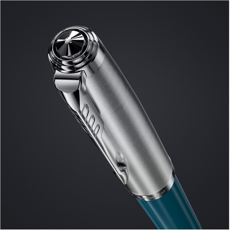 Элегантный обтекаемый силуэт обеспечивает плавный переход от корпуса к закрытому перу. Огранка верхушки колпачка напоминает перламутр и повторяет историческую модель Parker 51. Ручка имеет резьбу на корпусе для фиксации закручивающегося колпачка.
