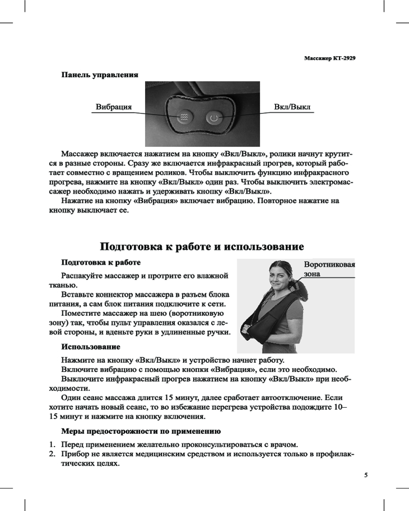 Массажёр включается нажатием на кнопку «Вкл/Выкл», сразу же включается инфракрасный прогрев, который работает совместно с вращением роликов. Чтобы выключить функцию инфракрасного прогрева, нажмите на кнопку «Вкл/Выкл». Кнопка «Вибрация» включает вибрацию.