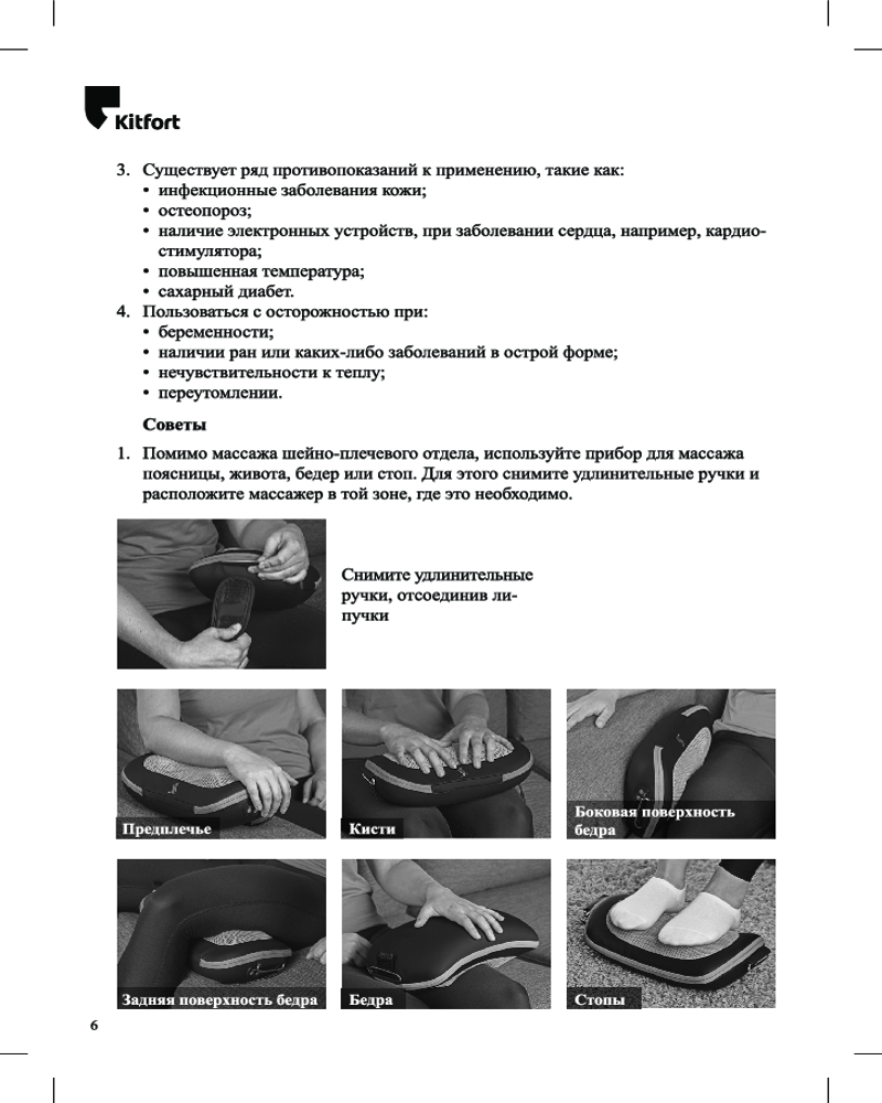 Помимо массажа шейно-плечевого отдела, используйте прибор для массажа других частей тела. Для этого снимите удлинительные ручки и расположите массажёр в той зоне, где это необходимо.