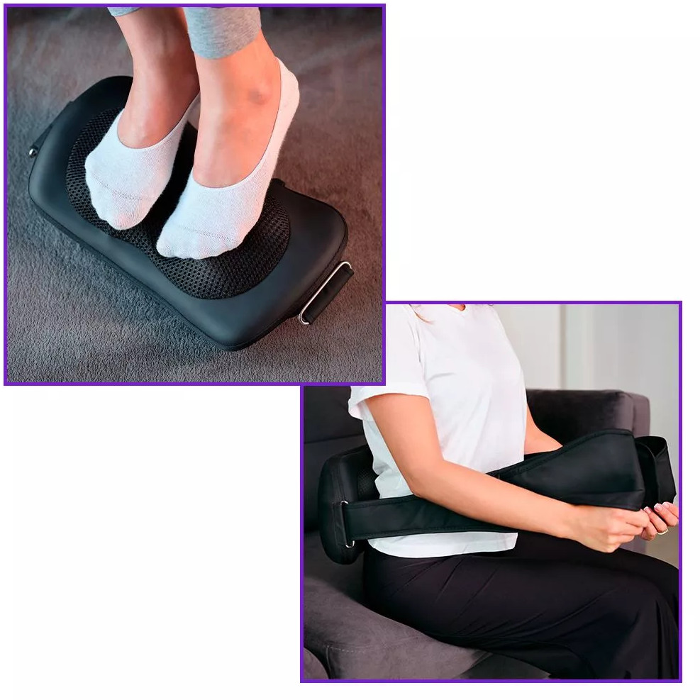 Воздействуя на шею, позвоночник и плечи массажными роликами, массажёр устраняет стресс и затекание мышц. Также устройство можно использовать для массажа поясницы, живота, бёдер и стоп.