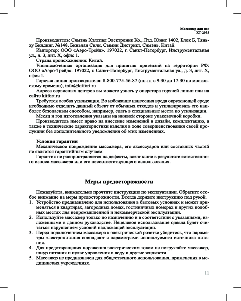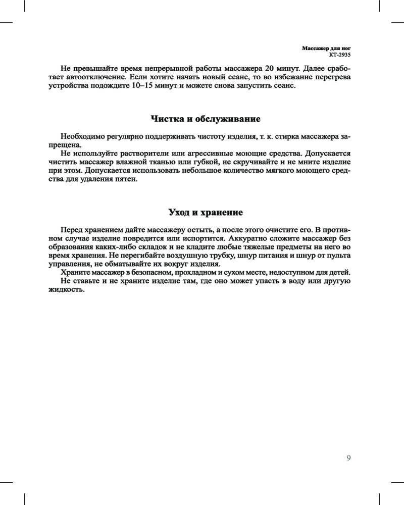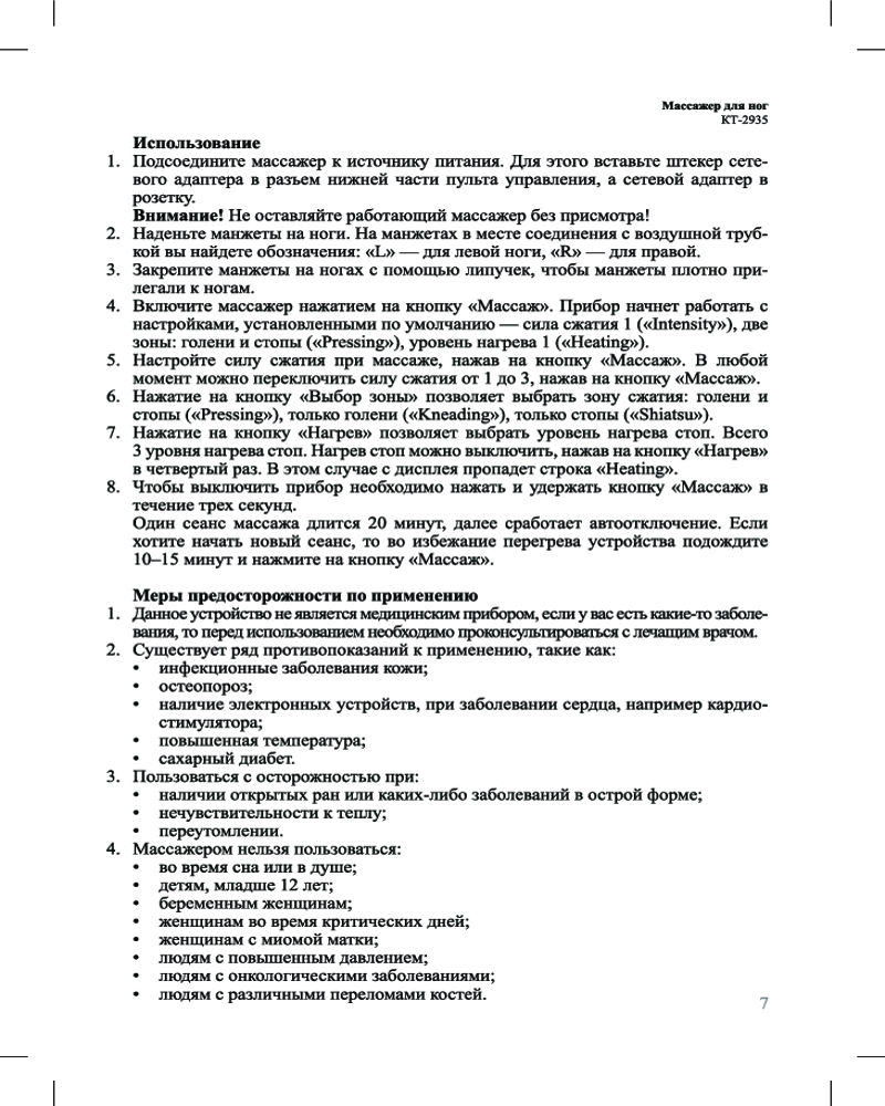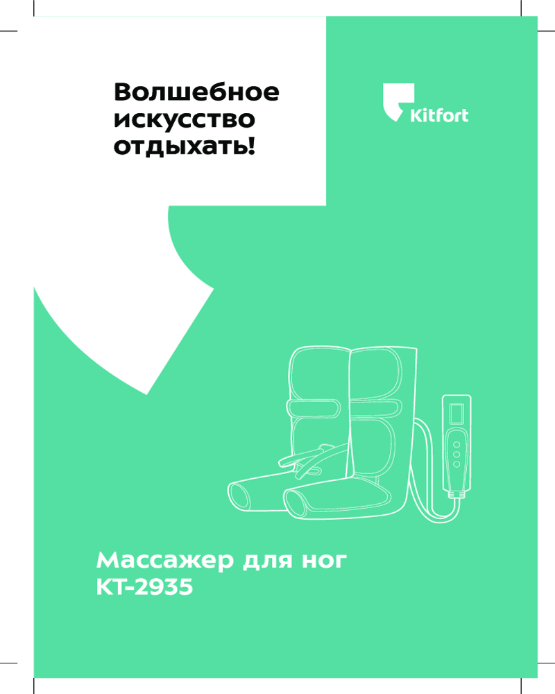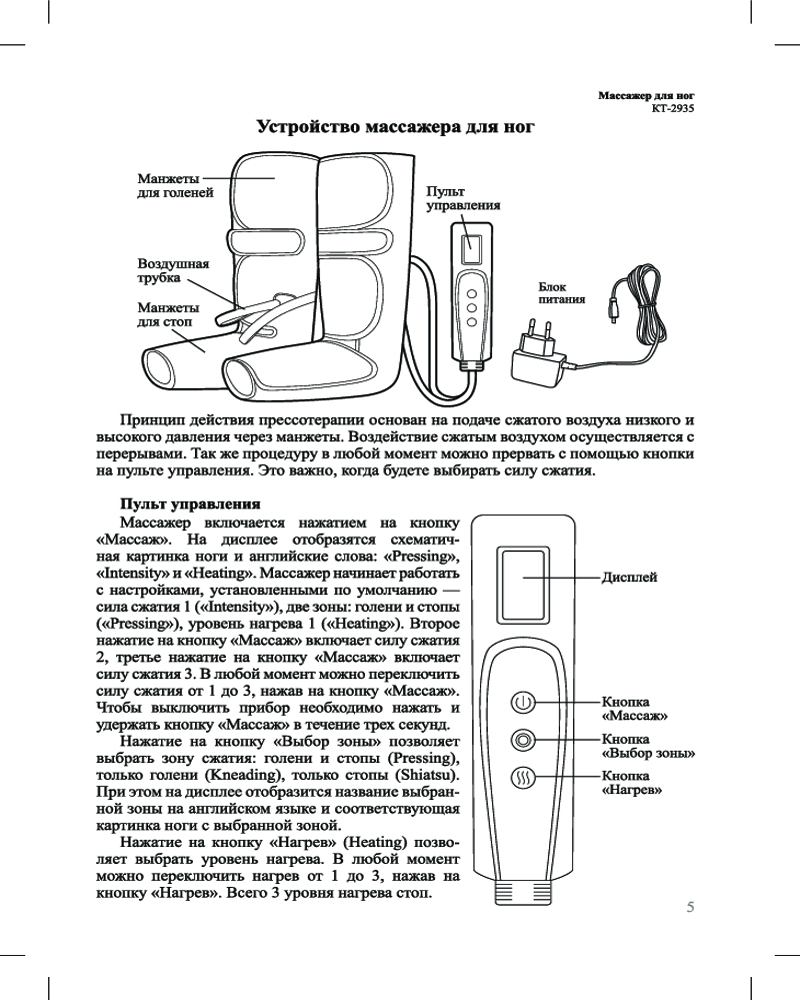 KT-2935 — массажёр для прессотерапии и лимфодренажа ног, с помошью которого можно сделать массаж икроножных мышц и стоп, не прибегая к посторонней помощи. Прибор сочетает в себе функцию воздушно-компрессионного массажа с нагревом в области стоп.