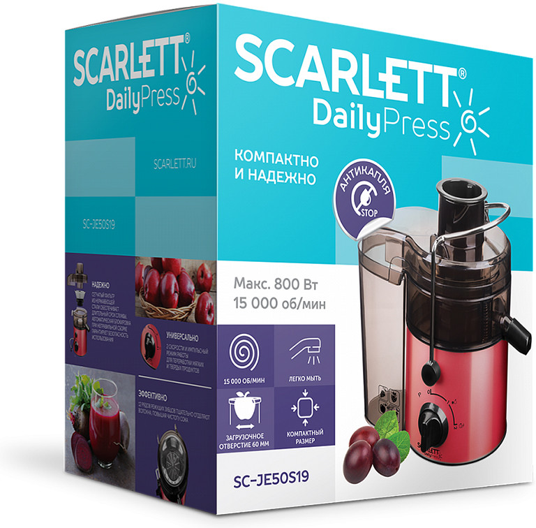 Соковыжималка SC-JE50S19 мощностью 800 Вт выполнена в компактном размере: высота 27,2 см, ширина 25 см, глубина 16 см, что позволяет ей занимать места на кухне не больше, чем чайник. Долговечный сетчатый фильтр из нержавеющей стали позволит соковыжималке прослужить долго и качественно. Функция антикапля, металлический корпус и лёгкая сборка. Широкая горловина 60 мм для подачи целых фруктов и овощей значительно экономит время и силы! Прозрачная крышка для контроля заполняемости емкостей позволяет наблюдать за процессом. Емкость для сбора мякоти 1000 мл и емкость для сбора сока 600 мл в комплекте. 2 скорости и импульсный режим работы помогут выбрать подходящий для продуктов любой плотности. Автоматическая блокировка при неправильной сборке позаботится о безопасности эксплуатации!