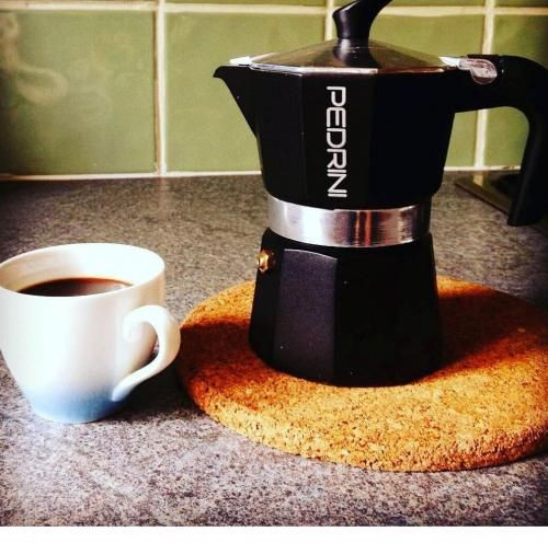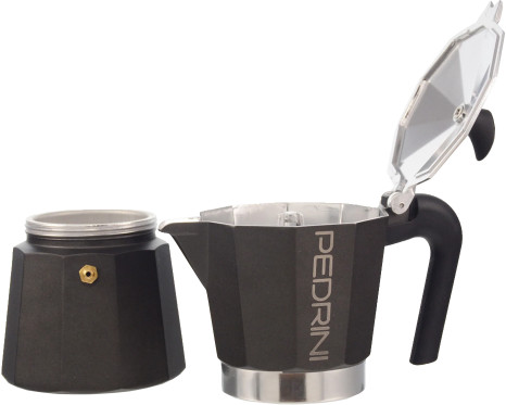 Коллекция «Aroma» от итальянского бренда «Pedrini» создана для тех, кому важны индивидуальность и стиль. Корпус выполнен из алюминия, а отделка окрашена в антрацитовый цвет, за исключением крышки и кольцевой гайки, оставленных в контрасте. Модель относится к гейзерному типу: вода из нижней части прибора проходит через фильтр с молотым кофе, и в верхнюю часть поступает уже готовый, крепкий и густой напиток. Прибор прост в эксплуатации. Удобная форма ручки обеспечивает комфортное пользование.