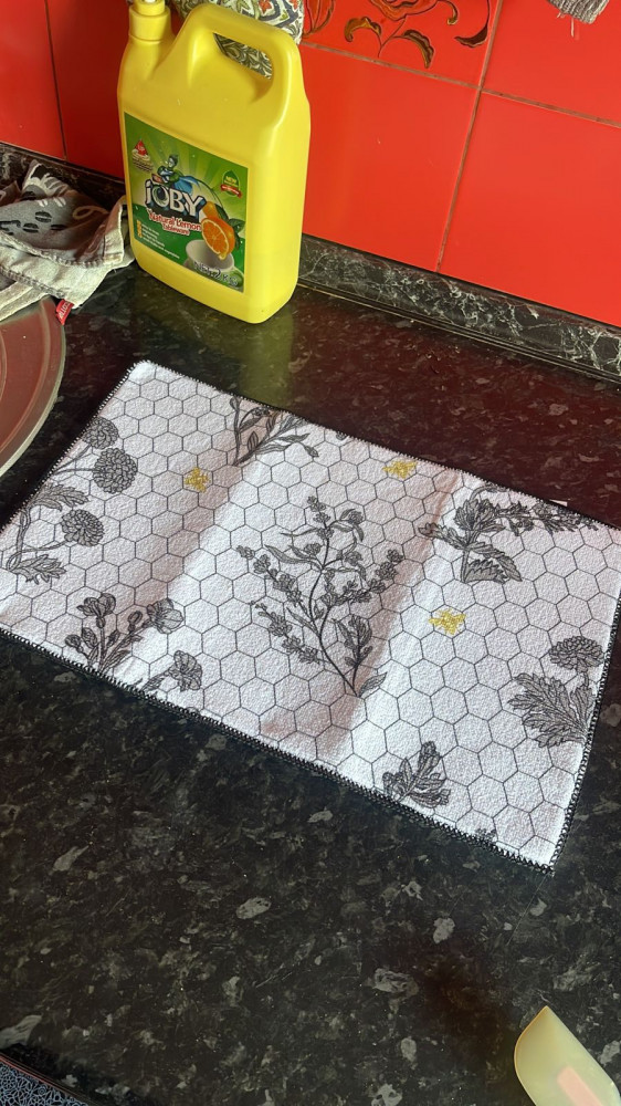 Отличный коврик. Впитывает очень хорошо, посуда не заветривается на коврике. Я очень довольна что приобрела его.