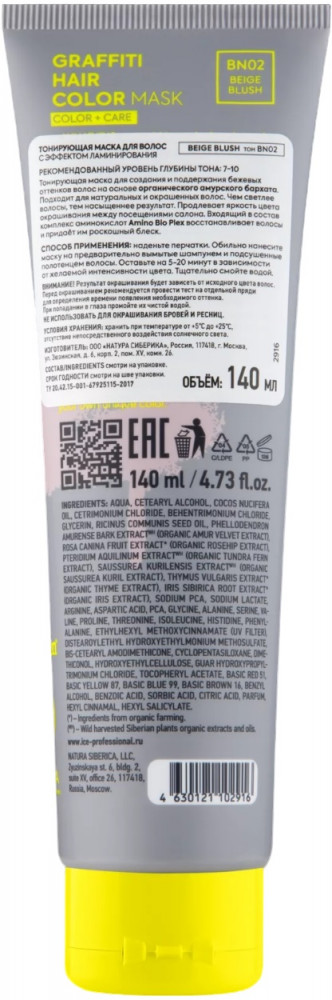 Natura Siberica Маска для волос тонирующая «Graffiti hair», оттенок BN02 Beige Blush