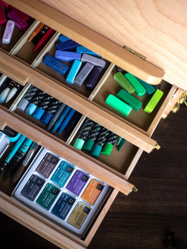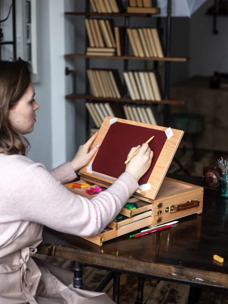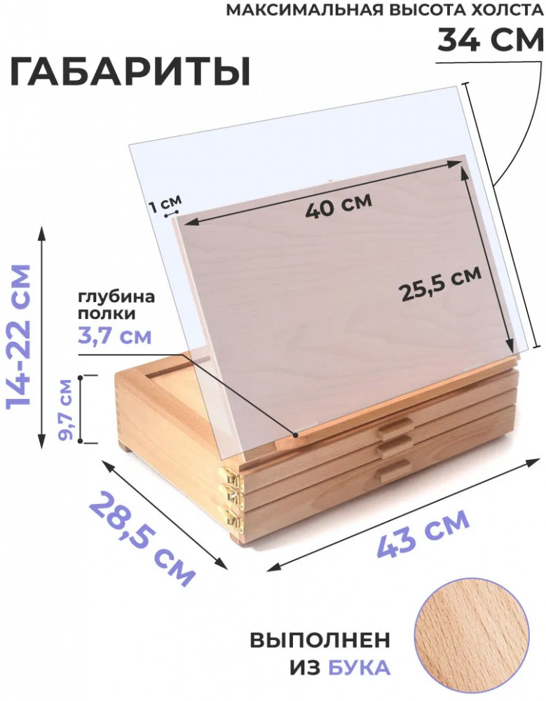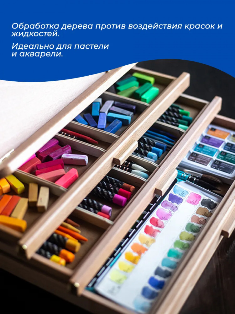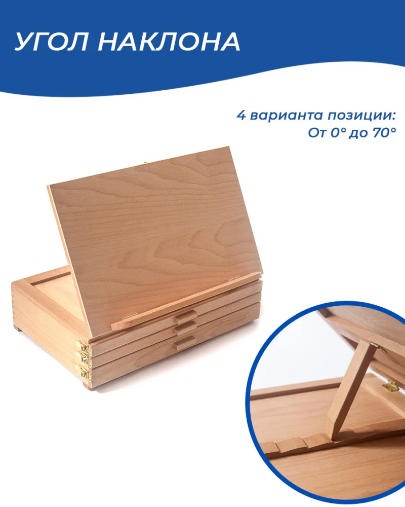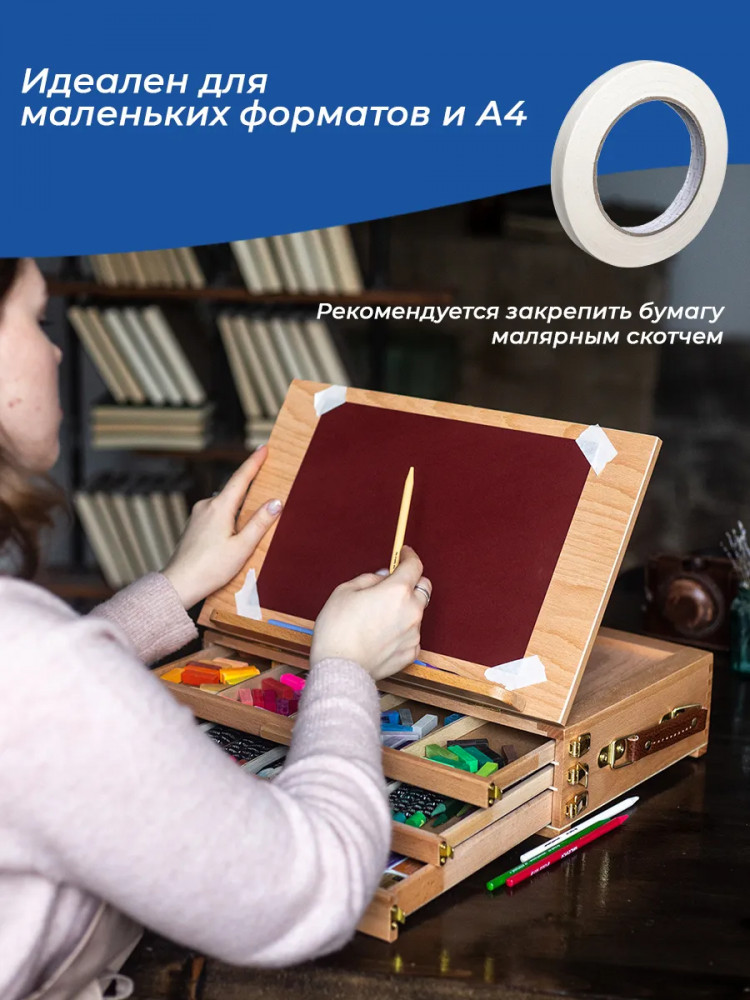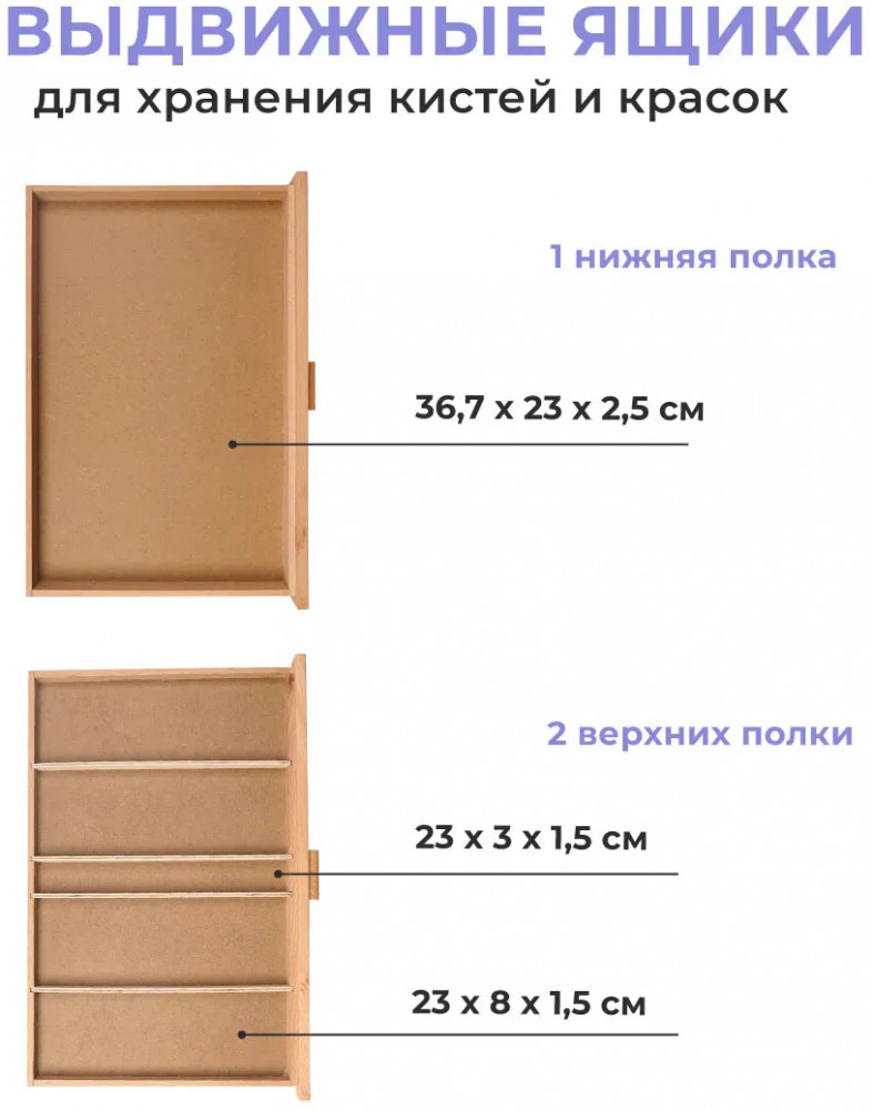 💳 Оплатить за товар можно при получении 🇰🇿 Есть бесплатная доставка по Казахстану от 1 дня 🎁 Копите бонусы с каждой покупки Настольный мольберт с выдвижными ящиками отлично подходит для акварели и пастели. На мольберте можно закрепить планшет с бумагой, а в ящиках хранить кисти, краски или пастель. Угол наклона регулируется. Ширина — 42 см, глубина — 28 см. Высота в сложенном виде — 12,5 см, в разложенном — 32,5 см. Вес — 3 кг. |