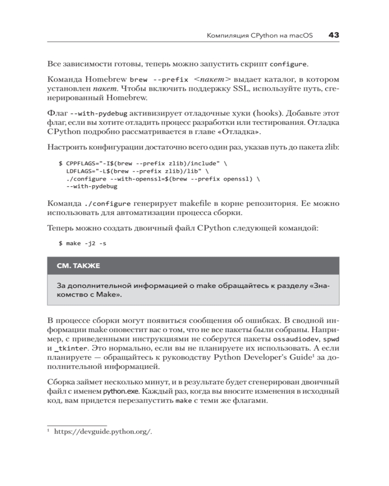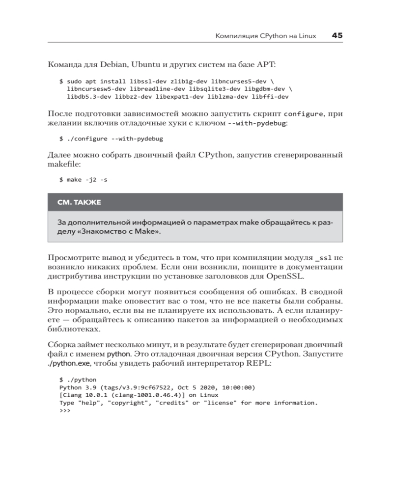 Внутри CPYTHON. Гид по интерпретатору PythonВ данный момент этот товар отсутствует в продаже. Возможно, у нас найдется аналогичный или похожий товар здесь. Серия: Библиотека программиста CPython, самая популярная реализация Python, абстрагируется от сложностей ОС и предоставляет платформу для создания масштабируемых и высокопроизводительных приложений. Каждому python-разработчику на какой-то стадии необходимо будет узнать, как работает CPython. Это позволит в полной мере использовать его мощь и оптимизировать приложения. Вы разберетесь с основными концепциями внутреннего устройства CPython и научитесь: читать исходный код интерпретатора CPython и свободно ориентироваться в нем; вносить изменения в синтаксис Python и компилировать их в вашу собственную версию CPython; понимать внутреннюю реализацию таких структур, как списки, словари и генераторы; управлять памятью CPython; масштабировать код Python за счет параллелизма и конкурентного выполнения; дополнять базовые типы новой функциональностью; выполнять наборы тестов; профилировать и проводить бенчмарк Python-кода и исполнительной среды; отлаживать код C и Python на профессиональном уровне; изменять или обновлять компоненты библиотеки CPython, чтобы они могли использоваться в будущих версиях. |