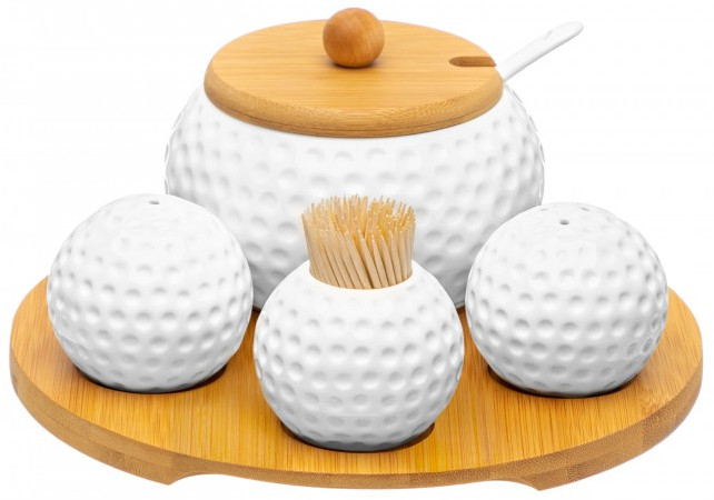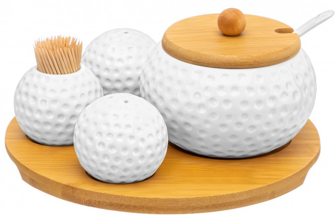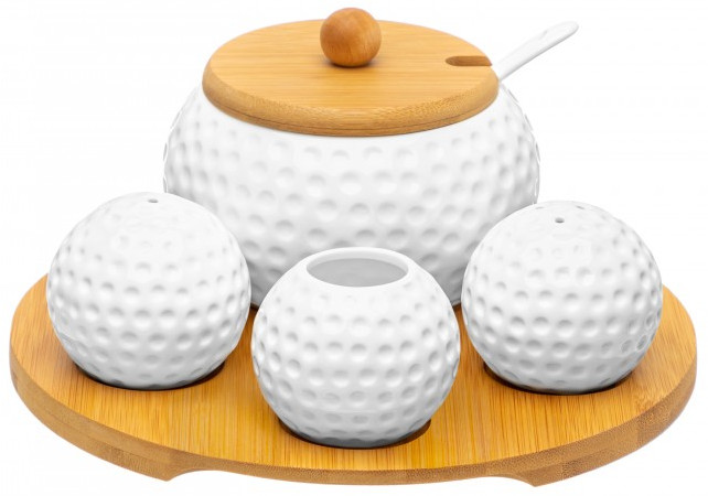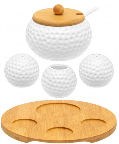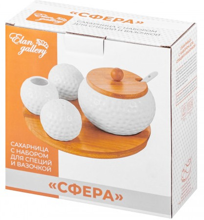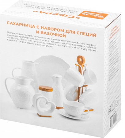 Набор для специй из серии посуды «Сфера» сможет стать настоящим украшением кухни или приятным подарком для ваших родных и близких! Набор выполнен из высококачественного фарфора и натурального бамбука. Сахарница, емкости для специй и вазочка под зубочистки украшены рельефными узорами. Емкости для специй снизу имеют отверстия для наполнения, которые закрываются пластиковыми пробками. Фарфоровые детали набора можно мыть в посудомоечной машине. Бамбуковые детали нельзя замачивать. Набор поставляется в яркой картонной упаковке.