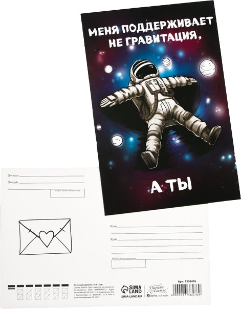 Дарите Счастье Карточка почтовая «Космонавт»В данный момент этот товар отсутствует в продаже. Возможно, у нас найдется аналогичный или похожий товар здесь. Серия: 14 Февраля Праздники — это не только повод повеселиться, но прежде всего отличная возможность встретиться с родными и друзьями, провести вместе время и обменяться памятными подарками. Открытка — это трогательный знак внимания для самых близких, а также приятный повод порадовать друзей и знакомых! |