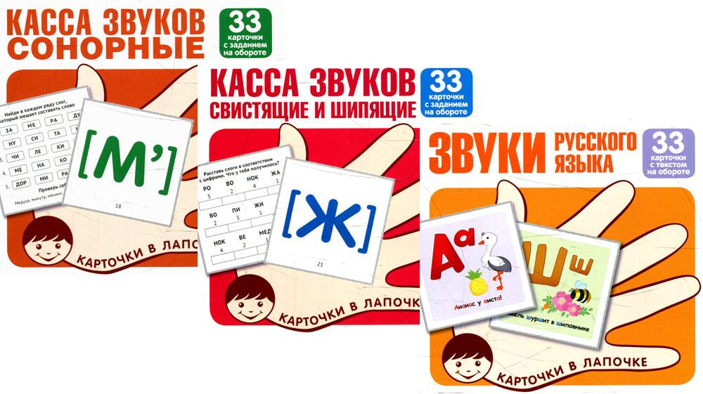 Комплект из 33 карточек познакомит ребенка со свистящими и шипящими звуками, научит правильно произносить звуки в слогах, словах и предложениях, классифицировать всегда мягкие и всегда твердые звуки, поможет отработать артикуляцию каждого звука и провести гимнастику языка и губ.