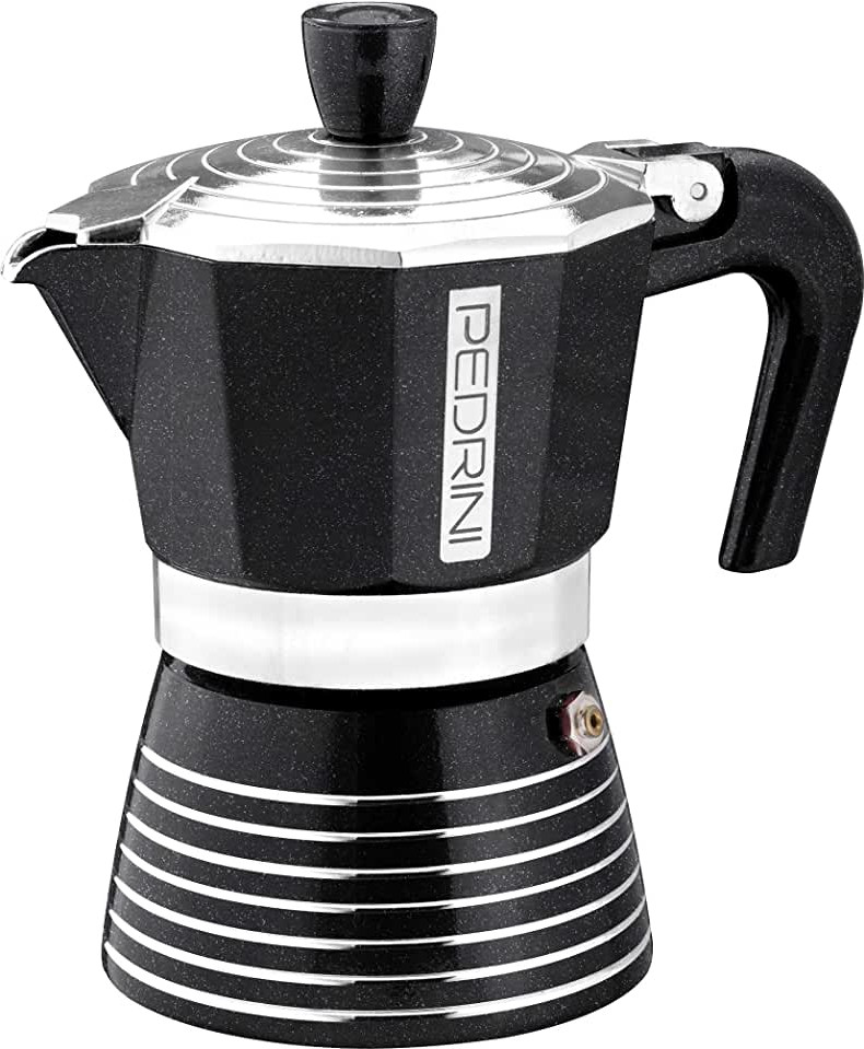 Алюминиевая кофеварка из коллекции «Infinity Passion» от итальянского бренда Pedrini создана специально для ценителей терпкого напитка. Модель относится к гейзерному типу: вода из нижней части прибора проходит через фильтр с молотым кофе, и в верхнюю часть поступает уже готовый, крепкий и густой напиток. Модель относится к гейзерному типу: вода из нижней части прибора проходит через фильтр с молотым кофе, и в верхнюю часть поступает уже готовый, крепкий и густой напиток. Кофеварка рассчитана на приготовление 3 чашек (примерно 60 мл каждая). Прибор прост в эксплуатации. Удобная форма ручки обеспечивает комфортное пользование.