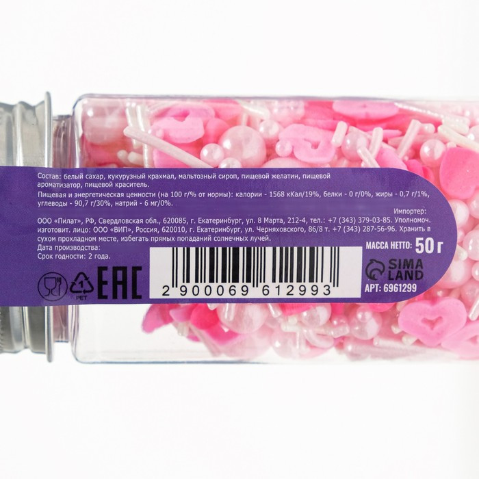Красивая посыпка нежного цвета. Фото соответствует. По вкусу понравилась. Упаковано хорошо, пластиковая баночка без запаха.