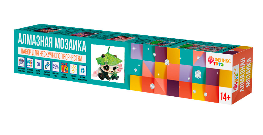 Алмазная мозаика — это популярный творческий набор, идея которого заключается в наклеивании акриловых кристаллов на схему, покрытую клеевой основой. На картине изображен милый малыш панда. Такая картина идеально впишется в интерьер вашего дома. Она подразумевает полное сплошное заполнение стразами. Размер полотна 20×30. Элементы мозаики представляют собой коллекцию глянцевых кристаллов из 30 различных цветов в пронумерованных пакетиках.