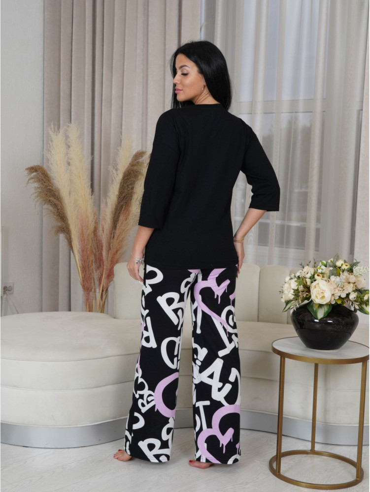 Хороший симпатичный костюм для дома. Трикотаж не тонкий. На 48 размер верх свободный. Резинка на брючках тугая.