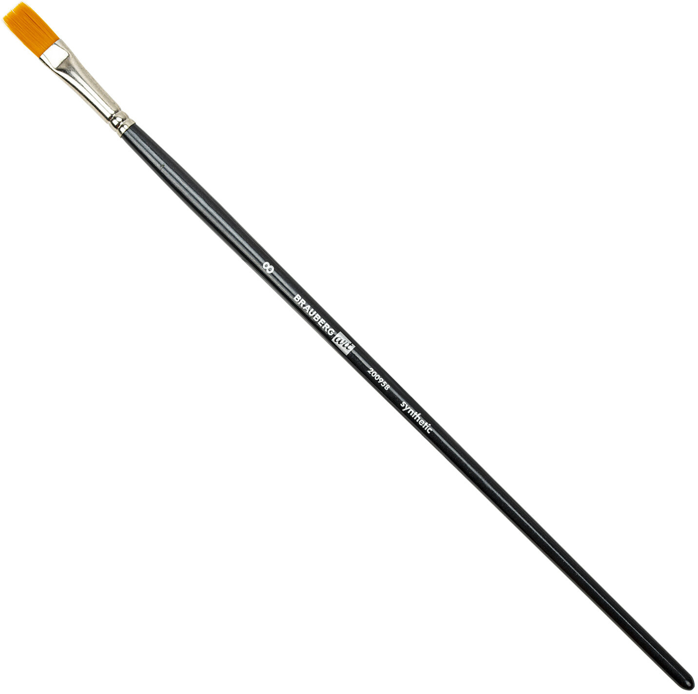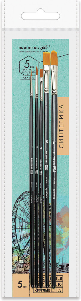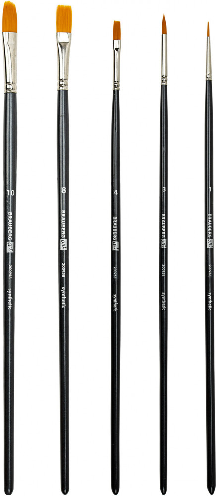Кисти изготовлены с применением высококачественной синтетики. Отличаются универсальностью в использовании, обусловленной упругостью ворса и прекрасными впитывающими свойствами пучка. Длинная ручка из древесины покрыта лаком, что защищает ее от воздействия красок и влаги. Форма пучка — круглая № 1, 3; плоская № 4, 8; овальная № 10. Номер кисти соответствует реальной ширине пучка в миллиметрах. Упаковка — пакет с европодвесом и картонной подложкой.