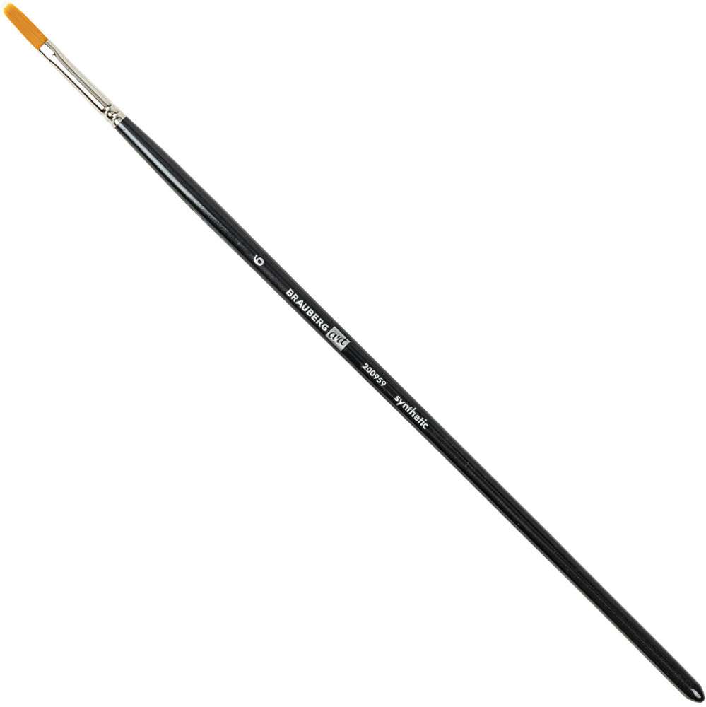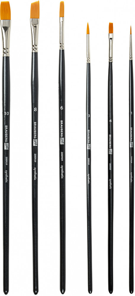 Кисти изготовлены с применением высококачественной синтетики. Отличаются универсальностью в использовании, обусловленной упругостью ворса и прекрасными впитывающими свойствами пучка. Длинная ручка из древесины покрыта лаком, что защищает ее от воздействия красок и влаги. Форма пучка — круглая № 1, 3; плоская № 4, 10; cкошенная — № 8; овальная № 6. Номер кисти соответствует реальной ширине пучка в миллиметрах. Упаковка — пакет с европодвесом и картонной подложкой.
