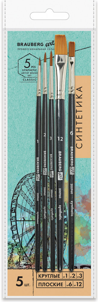 Кисти изготовлены с применением синтетики. Отличаются универсальностью в использовании, обусловленной упругостью ворса и прекрасными впитывающими свойствами пучка. Длинная ручка из древесины покрыта лаком, что защищает ее от воздействия красок и влаги. Форма пучка — круглая № 1, 2, 3; плоская № 6, 12. Номер кисти соответствует реальной ширине пучка в миллиметрах. Упаковка — пакет с европодвесом и картонной подложкой.