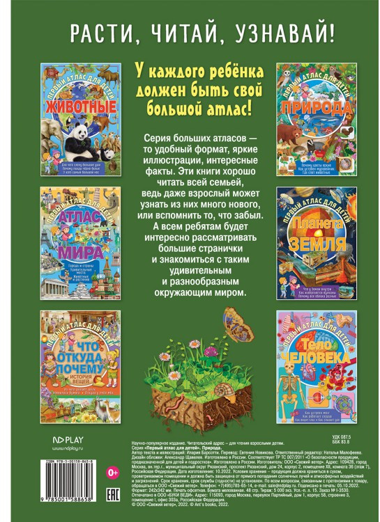 ND Play Атлас для детей «Природа»В данный момент этот товар отсутствует в продаже. Возможно, у нас найдется аналогичный или похожий товар здесь. Из маленького семечка вырастает огромное дерево, из яйца появляется на свет птенец, а маленькая капелька воды совершает огромный путь, чтобы стать частью океана. Эти удивительные события происходят на Земле каждый день. Все это — части природы нашей планеты, где царят сложные, но необходимые законы. Наш атлас поможет заглянуть в мир животных и растений и узнать о них много нового. Серия больших атласов — это удобный формат, множество ярких иллюстраций и интересные факты. Эти книги хорошо читать всей семьей, ведь даже взрослый может узнать из них много нового. А всем ребятам будет интересно рассматривать большие странички, знакомиться с удивительным и разнообразным окружающим миром. |