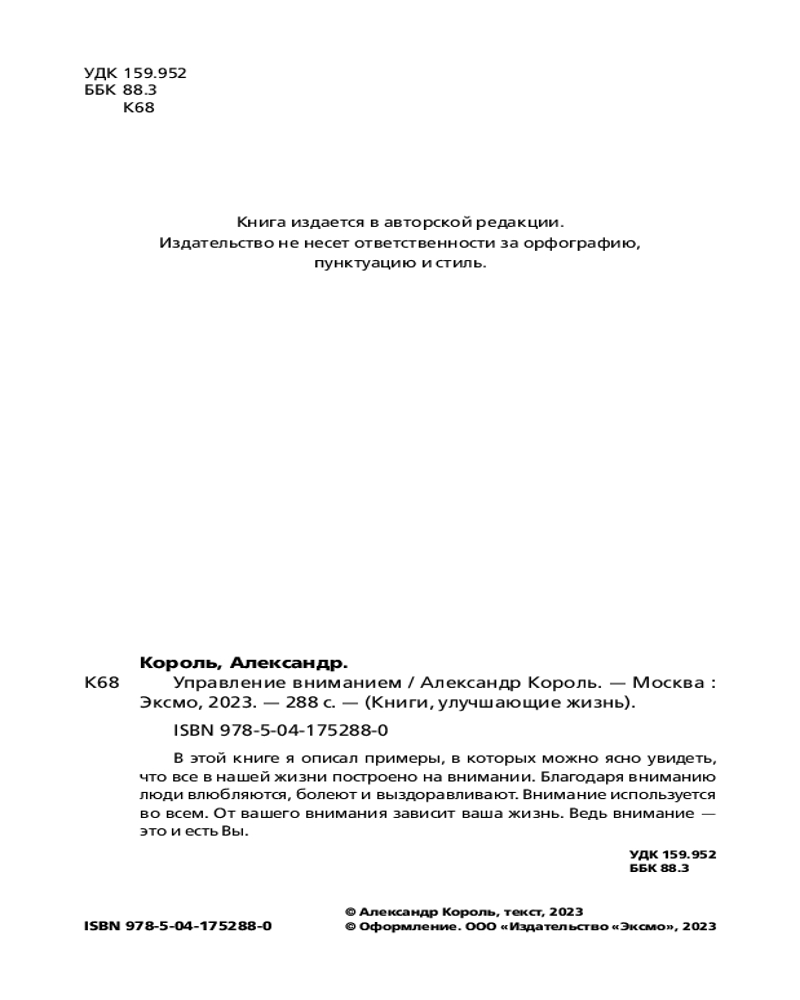💳 Оплатить за товар можно при получении 🇰🇿 Есть бесплатная доставка по Казахстану от 1 дня 🎁 Копите бонусы с каждой покупки Серия: Книги, улучшающие жизнь В этой книге автор описал примеры, в которых можно ясно увидеть, что все в нашей жизни построено на внимании. Благодаря вниманию люди влюбляются, болеют и выздоравливают. Внимание используется во всем. От вашего внимания зависит ваша жизнь. Ведь внимание — это и есть Вы. |