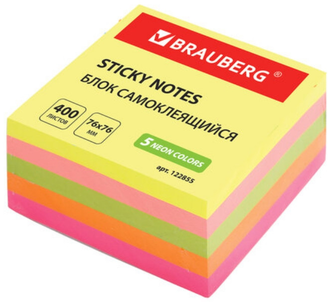 Бумага для заметок с клейким краем Brauberg рекомендуется для использования в процессе совещаний, обучения, мозговых штурмов. Идеально подойдет для работников офиса и руководителей. Стикеры 5 неоновых цветов (желтый, розовый, зеленый, оранжевый, малиновый) в форме куба 7,6 × 7,6 см состоят из 400 листов. Клейкий слой — 35 Н/м. Легко клеятся к любой поверхности. Не оставляют следов. Упакованы в полиэтиленовую пленку.