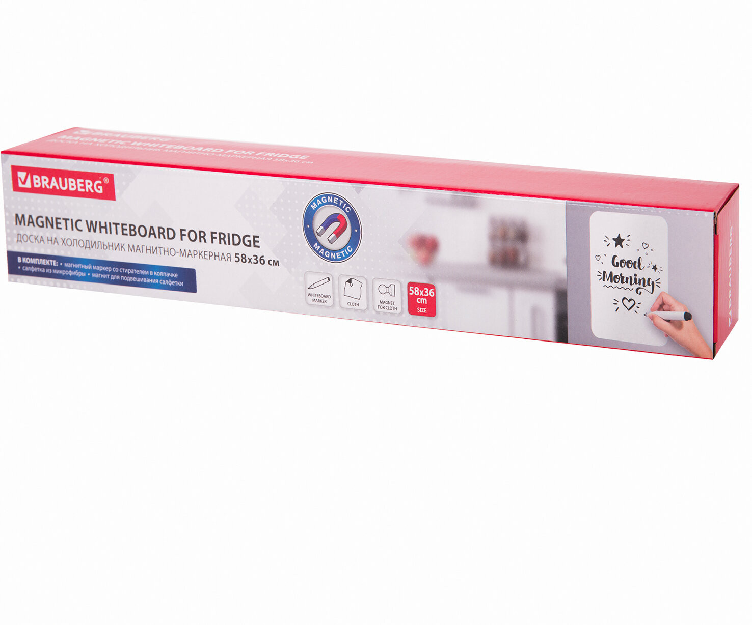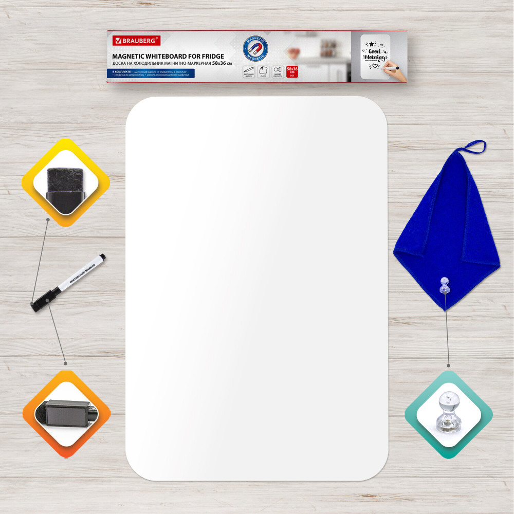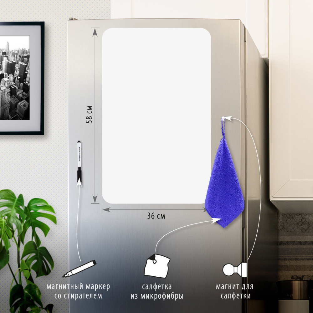 Очень хорошая вещь, пришел в коробке свёрнутый в трубочку, размер А4, быстро расправился на холодильнике без заломов и морщинок. Все нужное есть в комплекте, стирает и салфетка и губка на маркере. В общем 👍👍👍