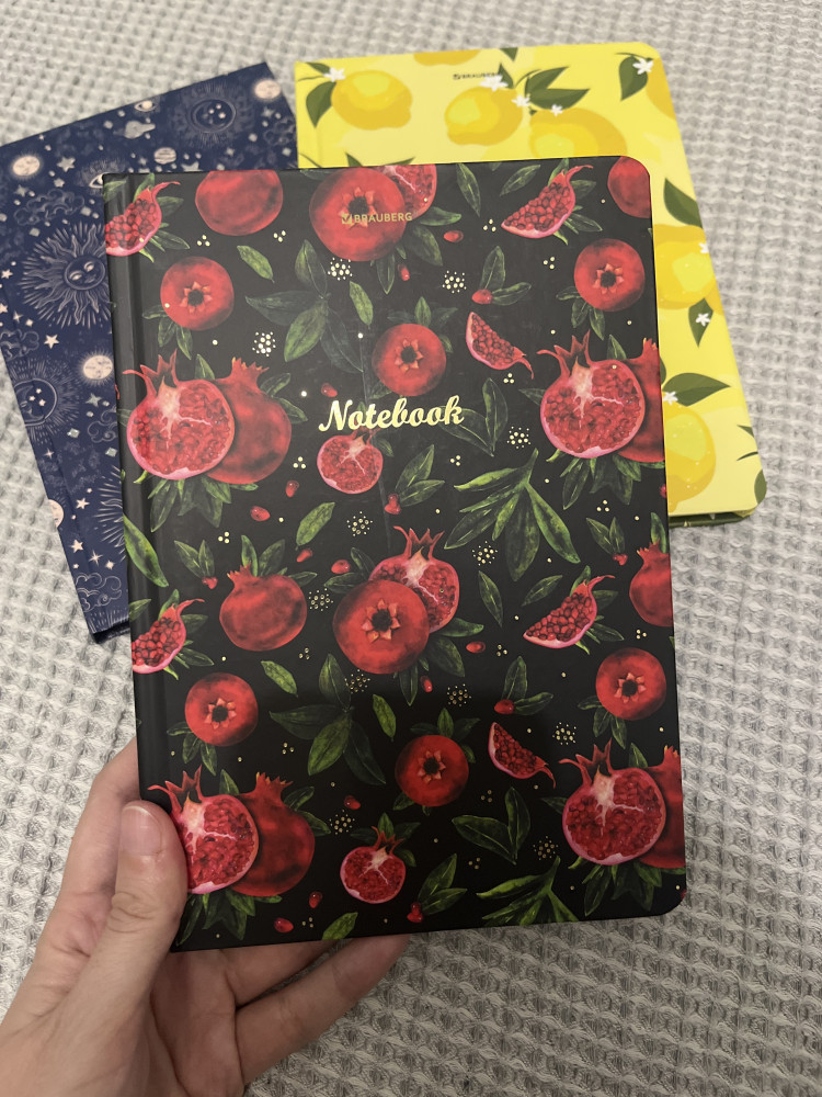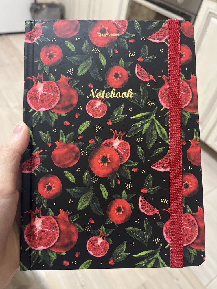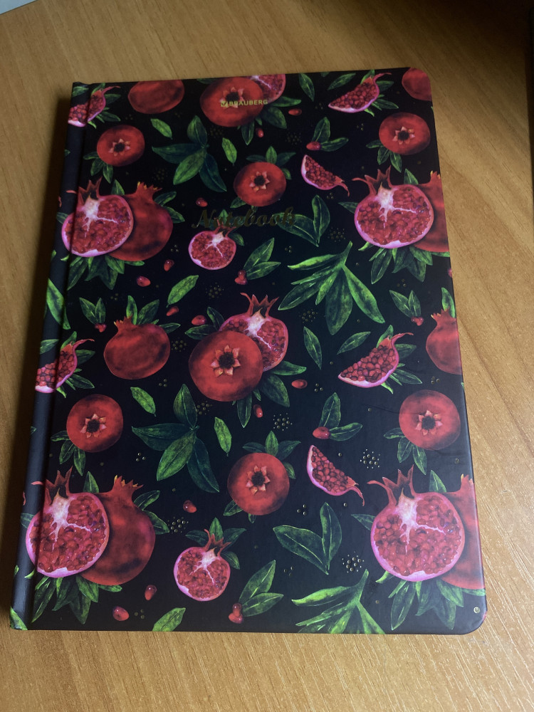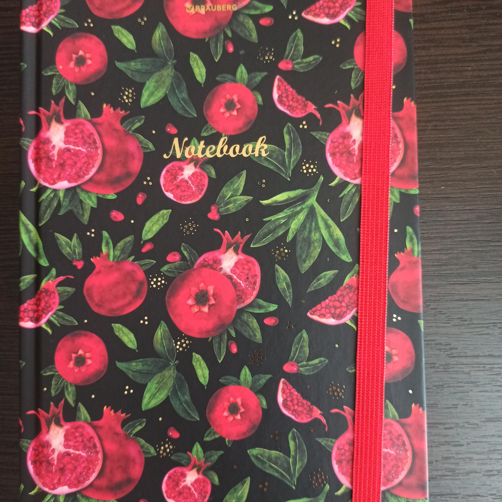 Очень красивое оформление! Твердый переплет и обычная клеточка. Можно писать дату, конечно, если хотите. Очень удобно все записывать. Есть резинка сзади, чтобы блокнот не открывался