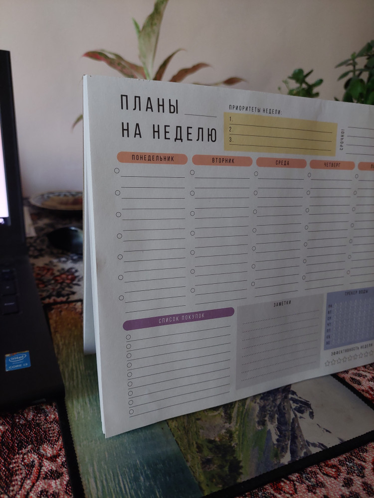 Очень удобно расписать основные задачи на неделю. Листочки отрываются хорошо. Спокойной расцветки и хорошей бумагой.