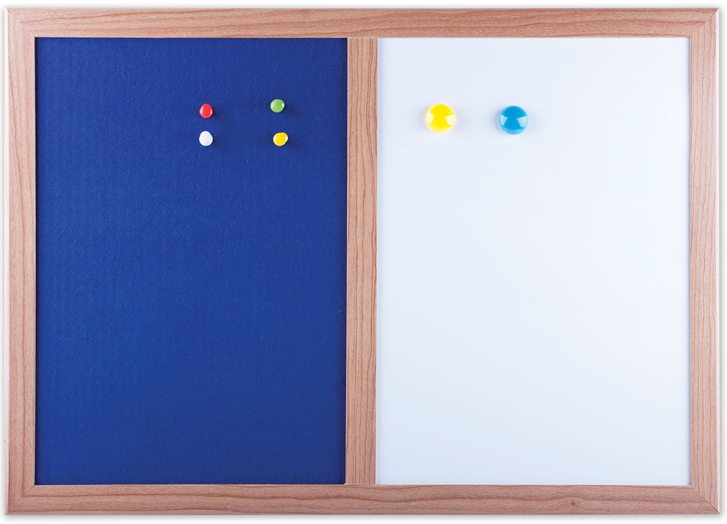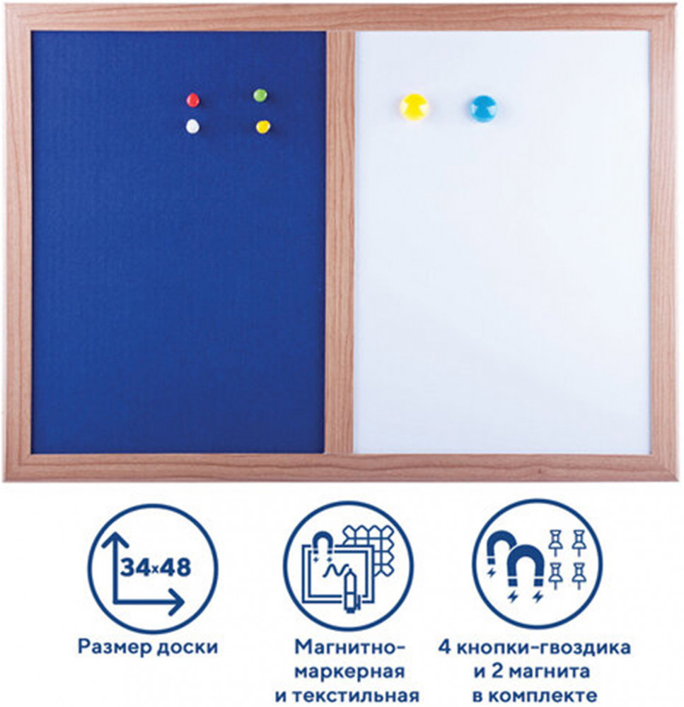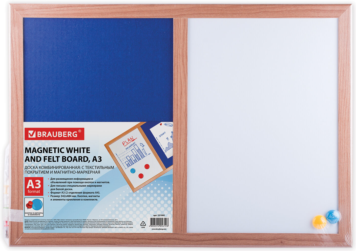 Комбинированная доска Brauberg — магнитно-маркерная и пробковая доски в единой рамке — позволит разместить объявления при помощи кнопок и офисных булавок. Широко используется в организациях различного рода деятельности. Сухостираемо-магнитная лакированная поверхность, соединенная с помощью деревянного профиля с пробковой поверхностью, покрытой тканью для более эстетичного вида. Доска выполнена в шлифованной лакированной деревянной рамке.