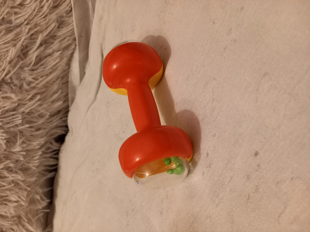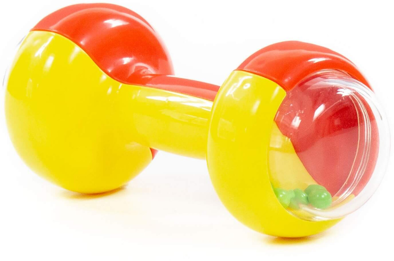Хорошая погремушка, ребёнок доволен, играет. удобно держать ребенку, так как гантелька миниатюрная. Качество изготовления-отличное, ни одной шероховатости. Не громко звучит.