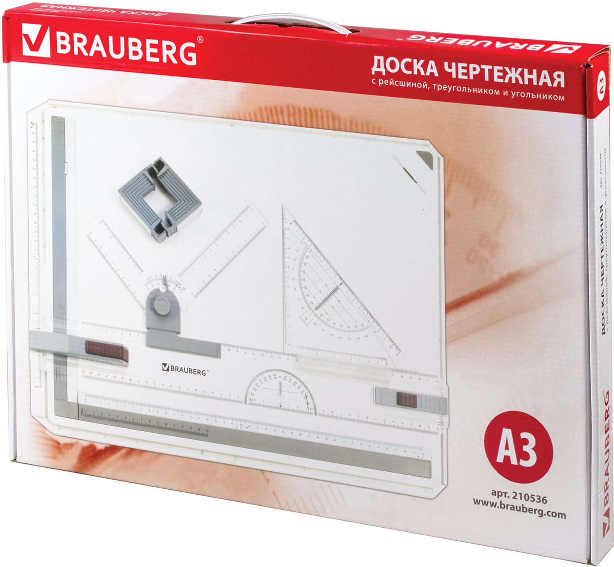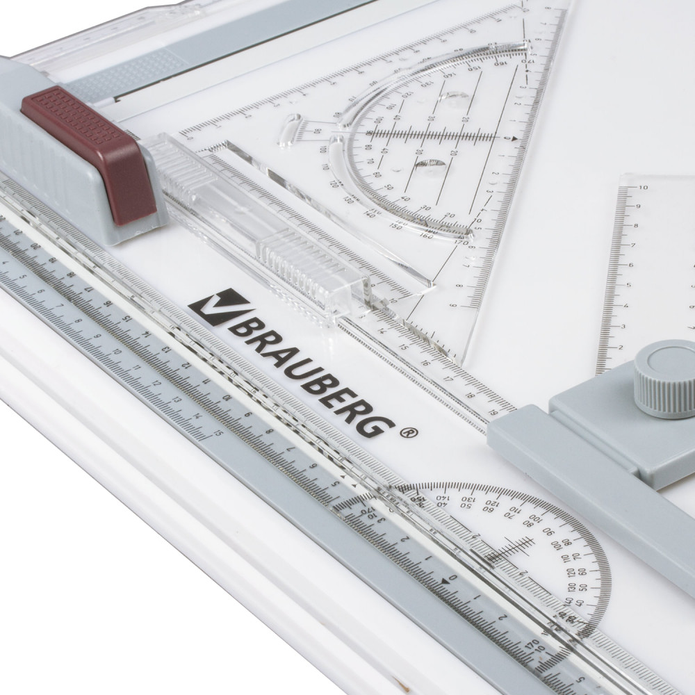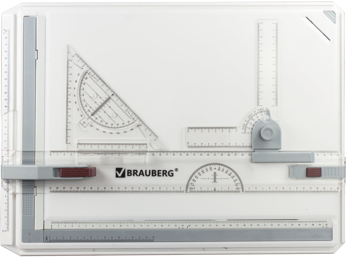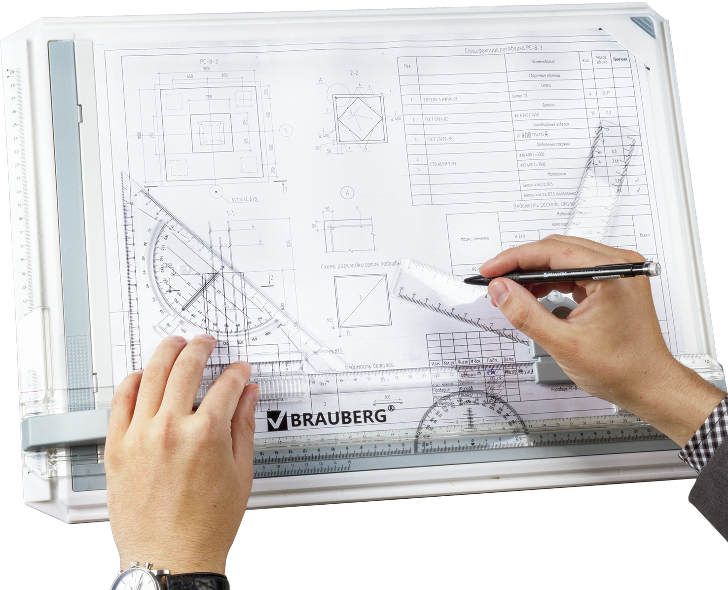 Чертежная доска Brauberg формата А3 с пластиковой линейкой подойдет как для студентов, так и для офисных работников. Обслуживается одной рукой, идеальна также для левшей. Выполненная из высокопрочного пластика чертежная доска Brauberg формата А3 оснащена антискользящими ножками из резины. В изделие встроен транспортир. Также доска содержит 2 измерительные шкалы и еще одну, предназначенную устанавливать разведение циркуля. Удобство фиксирования бумажного листа обеспечено за счет наличия специального зажимного устройства. Присутствуют подставки, используя которые удается разместить изделие под уклоном. Имеется рейсшина и возможность ее фиксирования с одной из четырех сторон благодаря механизму с блокировкой и пазом. Принимая решение купить чертежную доску размера А3, вы делаете выбор в пользу надежного в использовании изделия, позволяющего успешно справляться с поставленными задачами.