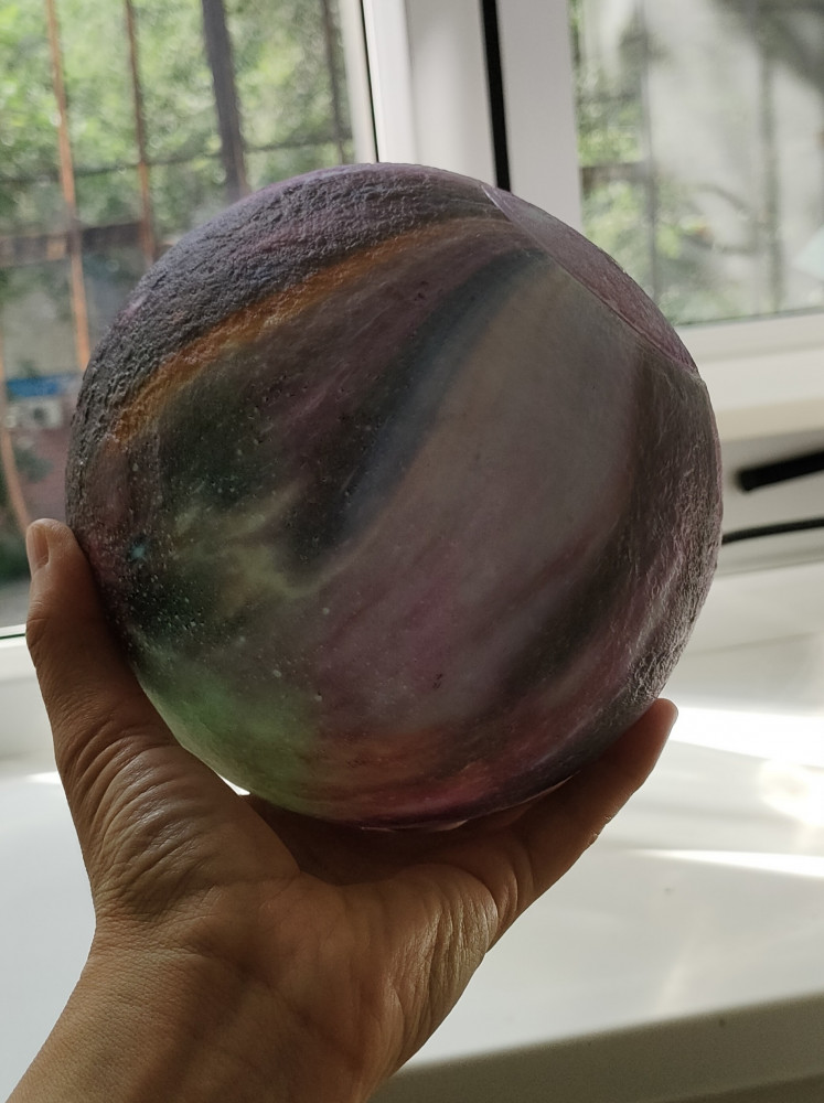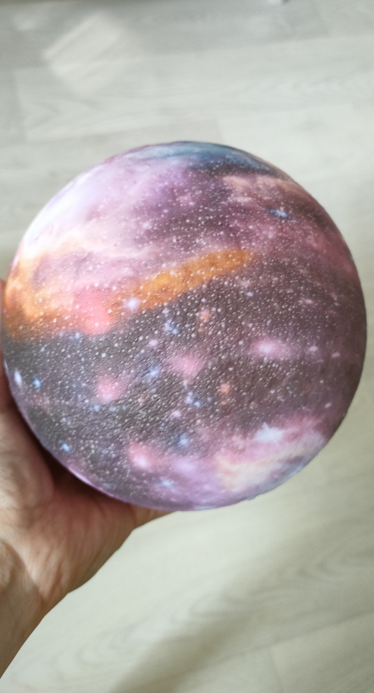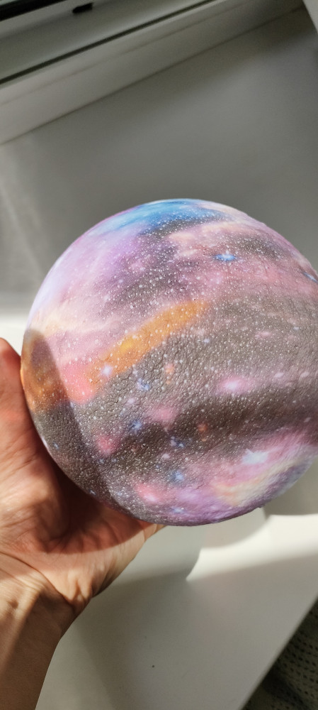 Фото товара не соответствует действительности. На фото он выглядит стеклянным, блестящим, даже местами с искорками. Но в реальности это пластиковый матовый шар с бледным размытым принтом. не ужас-ужас, но и не то, что на картинке. Немного разочарована, конечно. Из плюсов - подставка милая, пульт хорошо работает, питание от сети.
