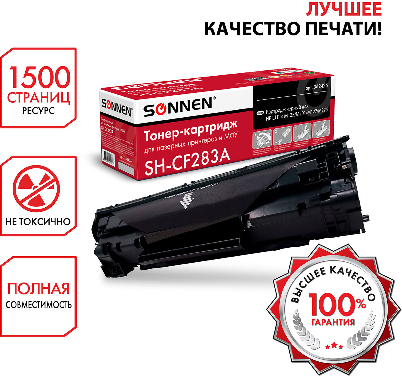 Совместимый лазерный картридж — это оптимальная альтернатива оригинальному картриджу HP CF283A, он не уступает оригиналу ни по качеству печати, ни по экономичности. Ресурс — 1500 страниц.