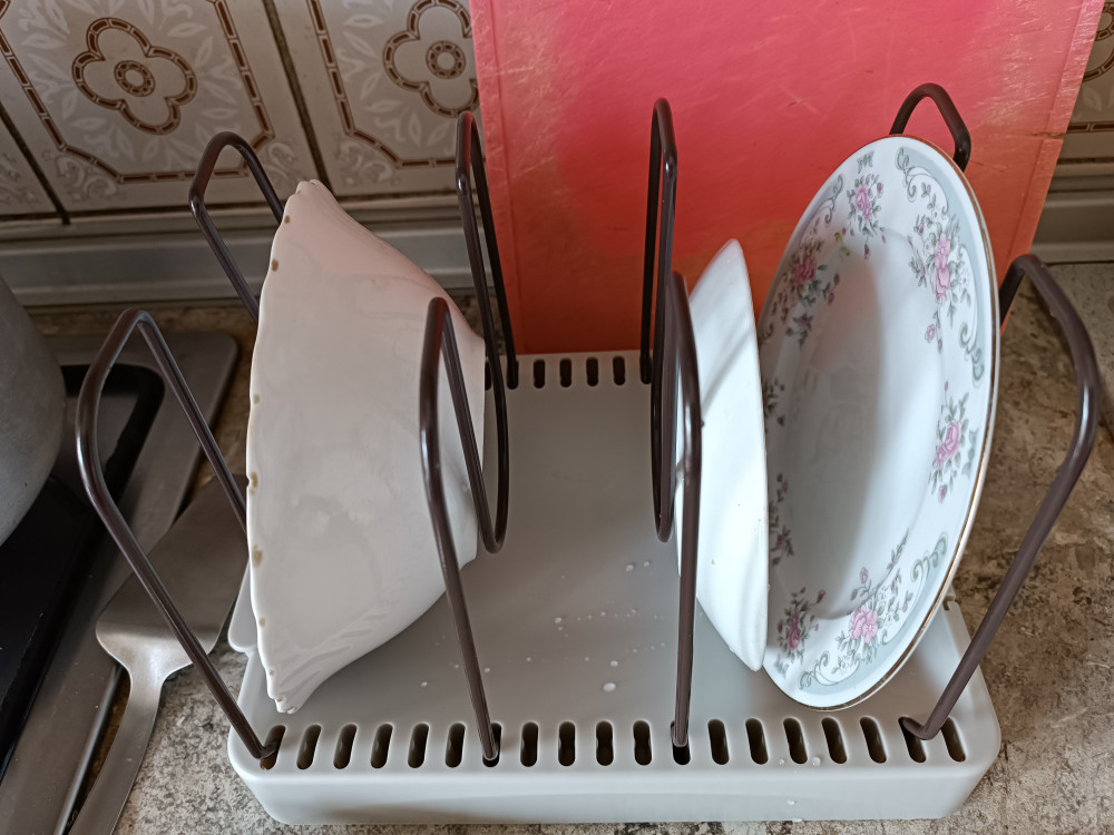 Подставка для посуды прочная и пластик и железные перегородки. Крупные тарелки стоят хорошо. Но мелкие тарелки соскальзывают. Поэтому можно поставить две тарелки одновременно, лицевой стороной друг к другу. Удобно что маленького размера. Стаканы можно повесить два на края железных перегородок. Рекомендую для покупки.