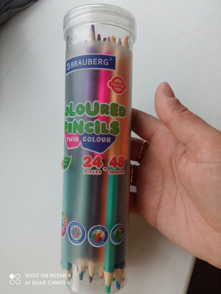 Очень удобный тубус и на одном карандаше два цвета, экономит место. Карандаши достаточно яркие, брала для антистресс раскраски.
