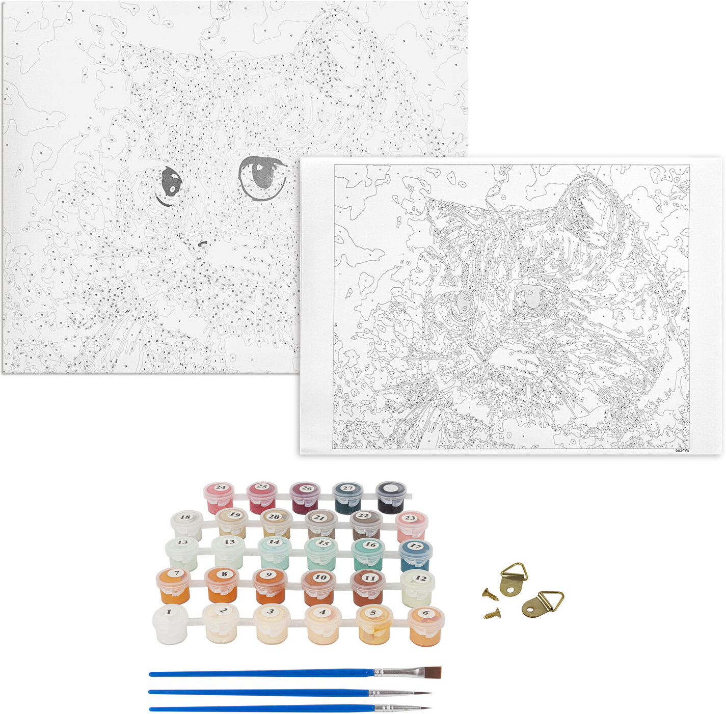 Состав набора: хлопковый холст на подрамнике с контуром, 1 лист бумаги для тренировки, акриловые краски объемом 3 мл каждая, 3 синтетические кисти и комплект металлических креплений для подвешивания на стену.