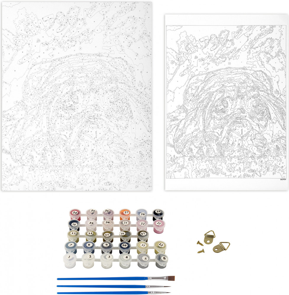 Состав набора: хлопковый холст на подрамнике с контуром, 1 лист бумаги для тренировки, акриловые краски объемом 3 мл каждая, 3 синтетические кисти и комплект металлических креплений для подвешивания на стену.
