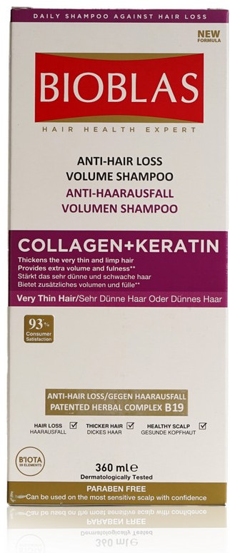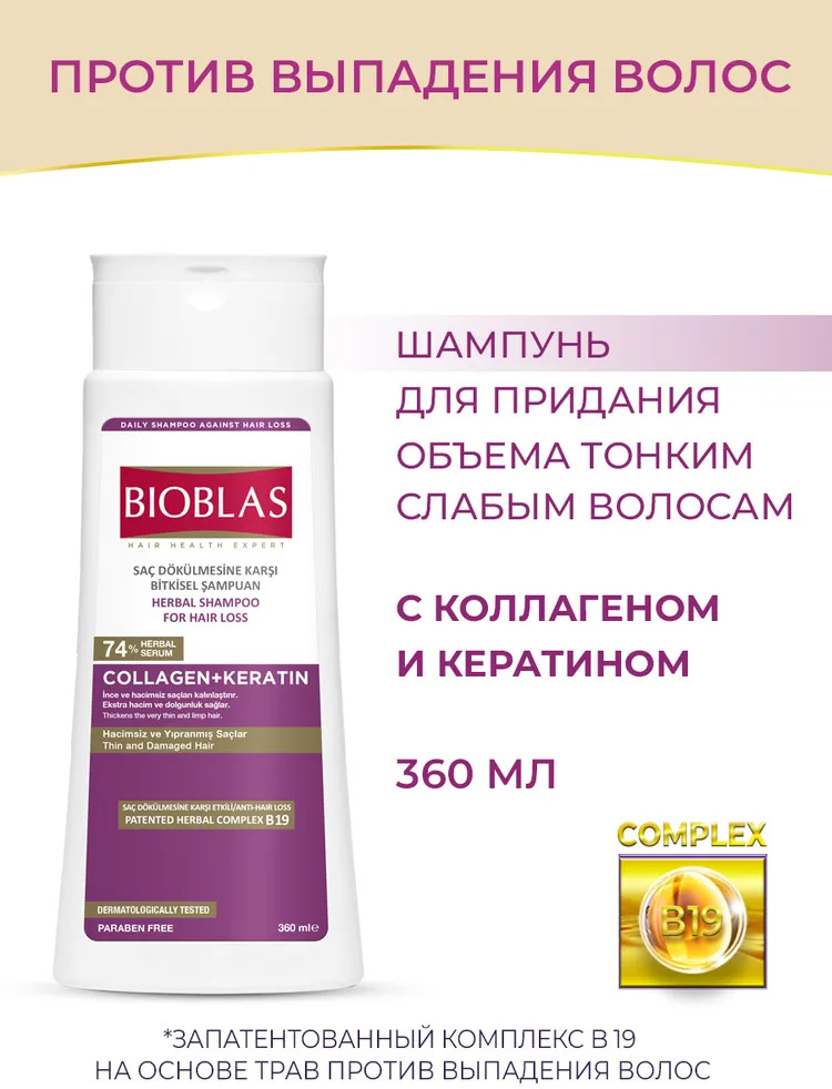 Bioblas Шампунь против выпадения волос с коллагеном и кератиномкачество эффект шампунь жирные волосы В данный момент этот товар отсутствует в продаже. Возможно, у нас найдется аналогичный или похожий товар здесь. Шампунь питает и утолщает очень тонкие волосы, придает им силу, дополнительный объем и блеск. Содержит запатентованный растительный комплекс с витамином B19 против выпадения волос. |