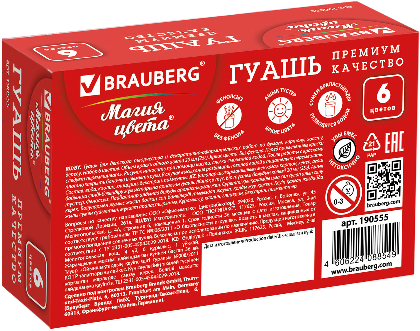 Школьная гуашь «Brauberg» идеально подходит для творчества и декоративно-оформительских работ. Хорошо наносится на бумагу, картон, дерево, стекло, керамику.