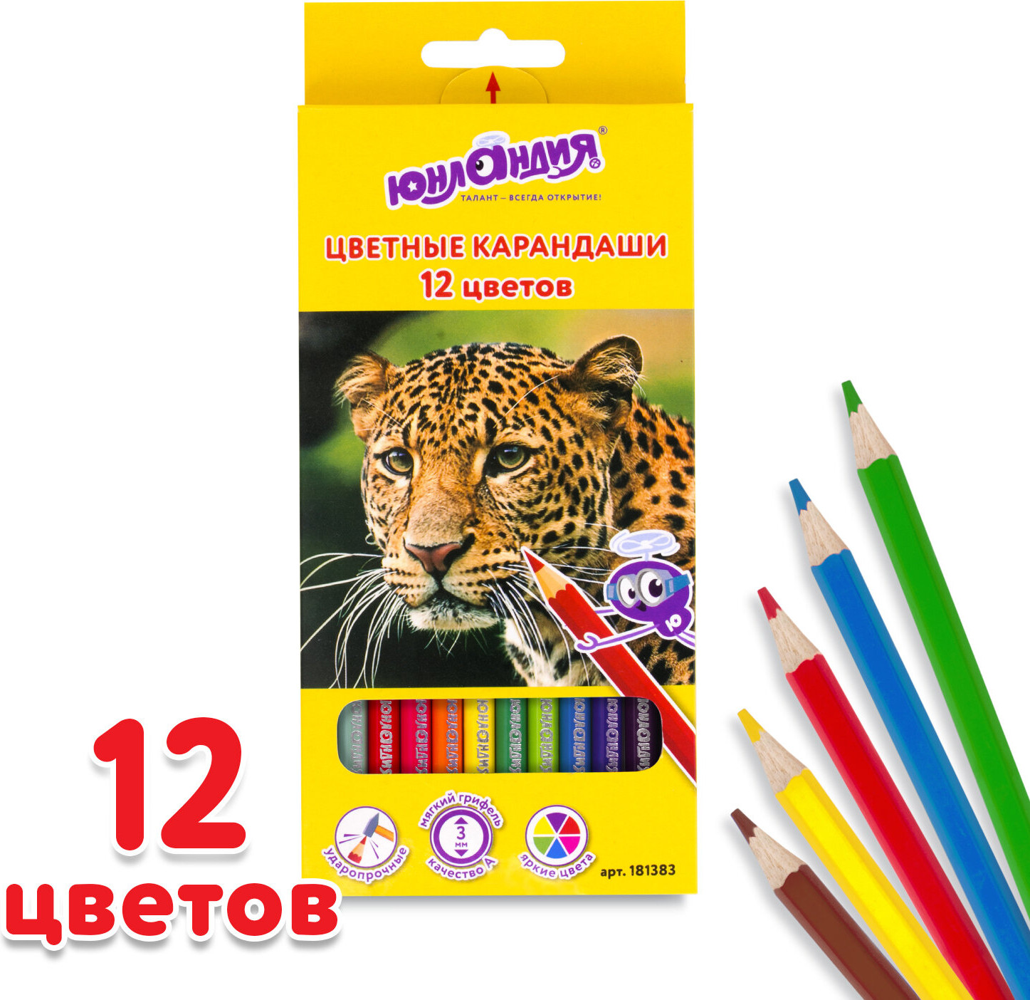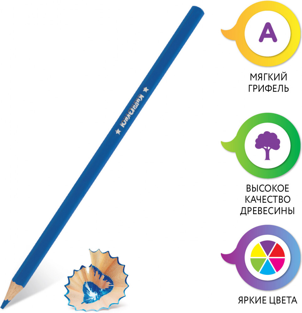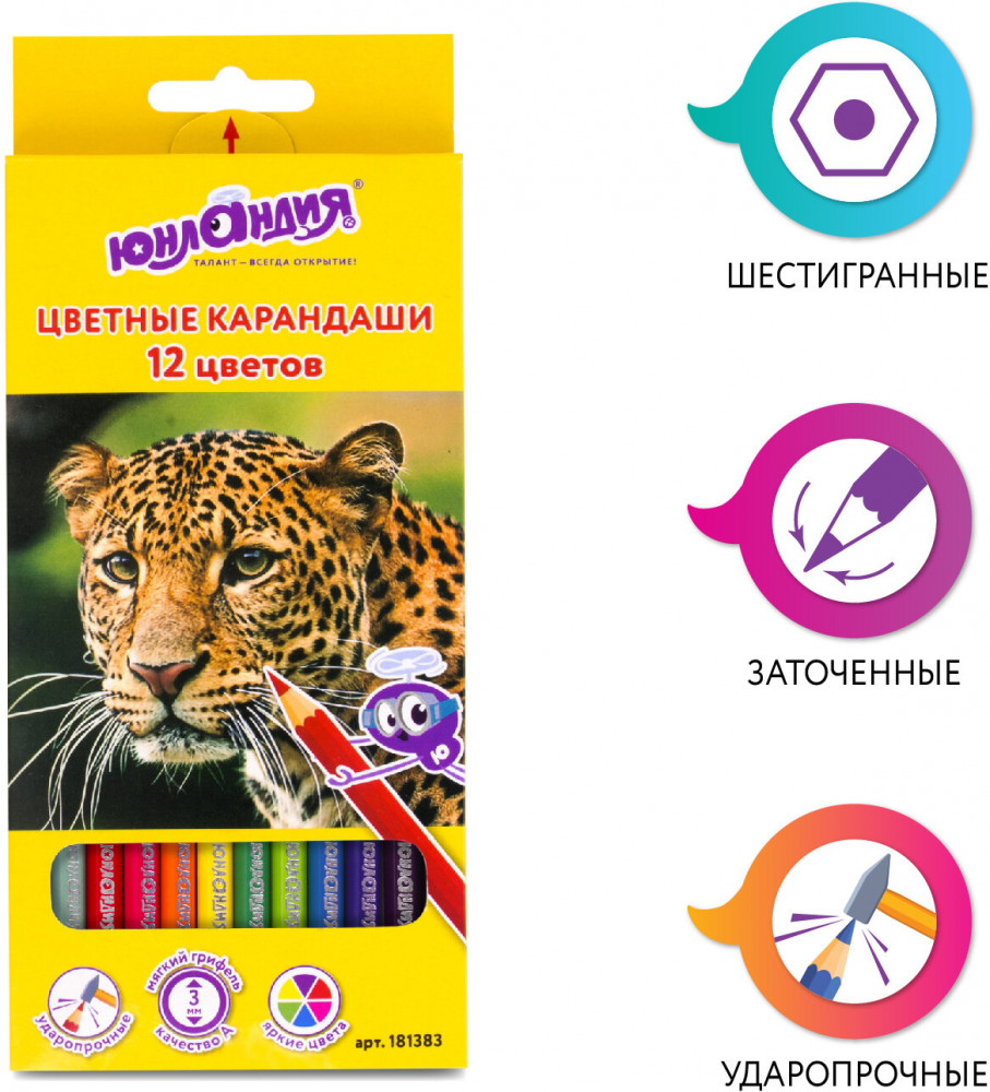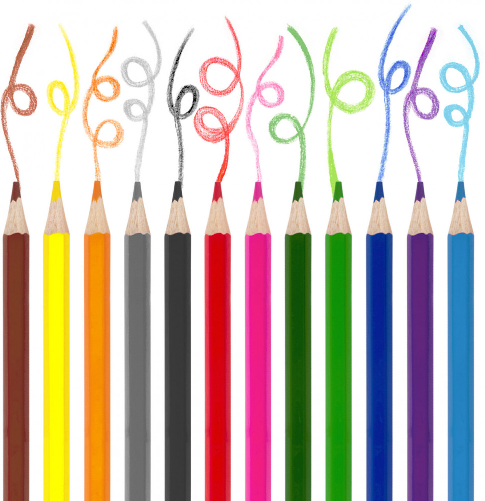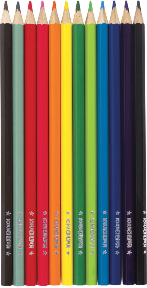 Набор состоит из 12 цветов: розовый, красный, желтый, оранжевый, салатовый, зеленый, голубой, синий, фиолетовый, коричневый, серый, черный. Яркие цвета развивают цветовосприятие ребенка. Шестигранная форма сечения корпуса позволяет не скатываться карандашу с поверхности стола во время занятий рисованием. Они изготовлены из древесины ценных пород и имеют лакированный корпус. Высокосортная древесина и качество исполнения гарантируют легкую заточку. Мягкий грифель качества «А» с диаметром 3 мм обладает повышенной прочностью, не ломается и не крошится при заточке. Все карандаши заточены и поставляются в картонной упаковке с европодвесом.