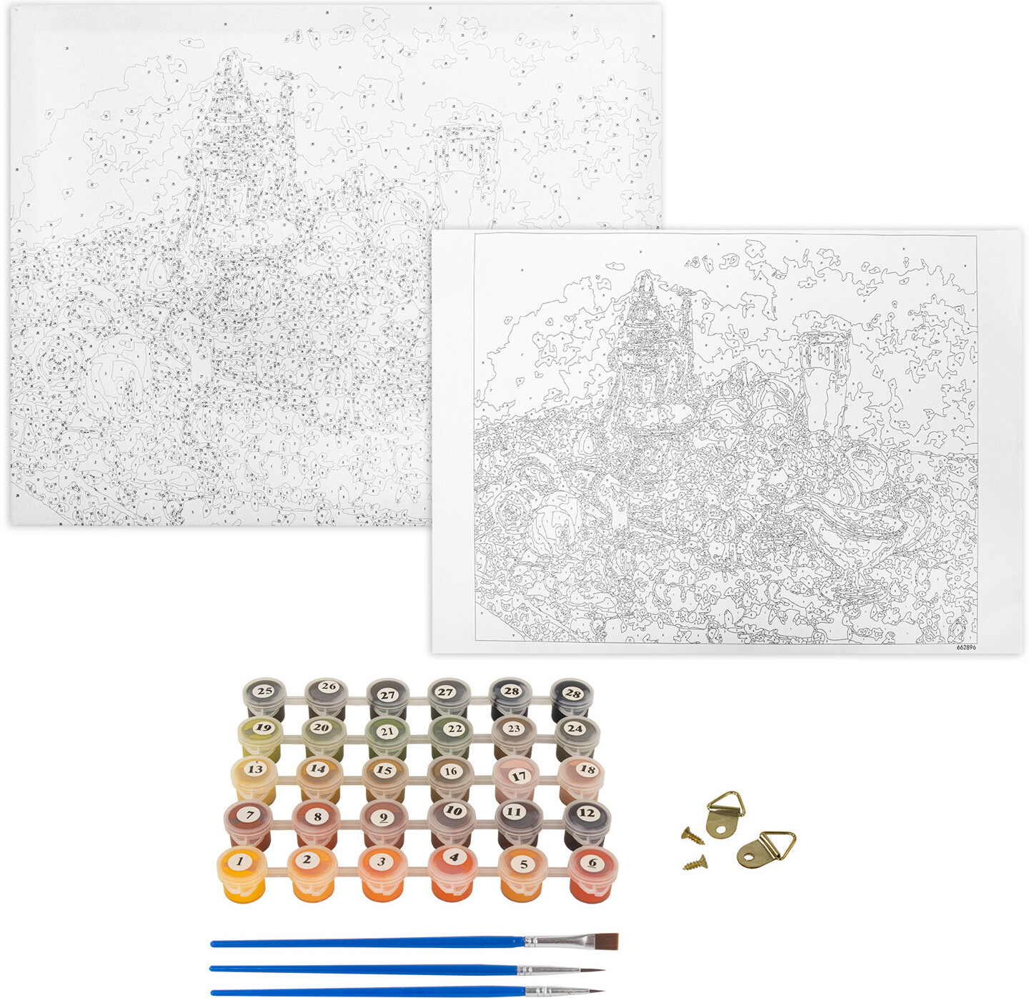 Состав набора: хлопковый холст на подрамнике с контуром, 1 лист бумаги для тренировки, акриловые краски объемом 3 мл каждая, 3 синтетические кисти и комплект металлических креплений для подвешивания на стену.
