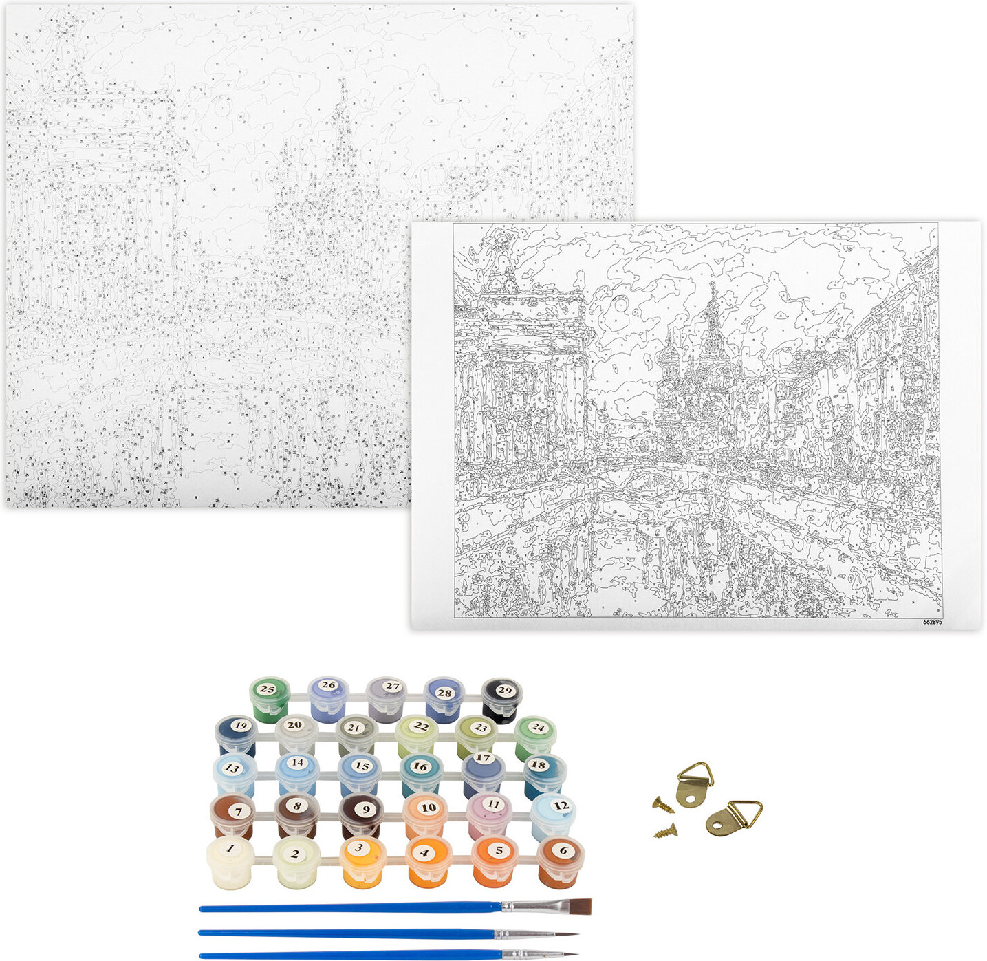 Состав набора: хлопковый холст на подрамнике с контуром, 1 лист бумаги для тренировки, акриловые краски объемом 3 мл каждая, 3 синтетические кисти и комплект металлических креплений для подвешивания на стену.