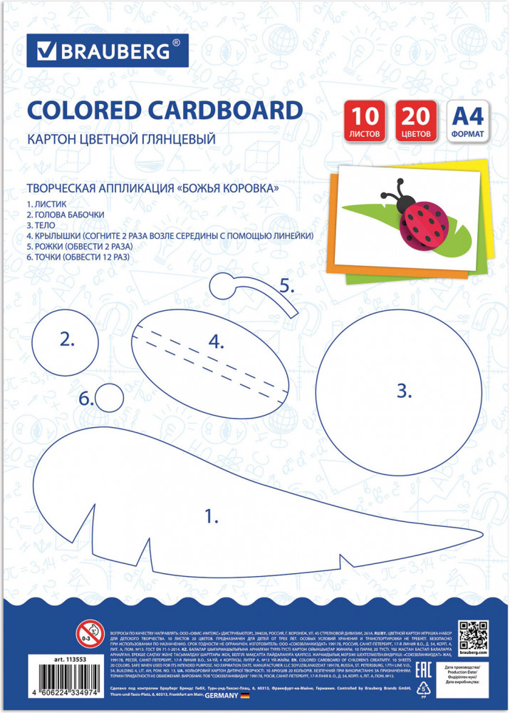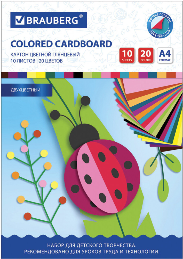 Набор цветного картона Brauberg предназначен для творчества и хобби и может использоваться детьми с трехлетнего возраста. Картон рекомендован для уроков труда и технологии. Творческая инструкция по созданию аппликации на обороте.