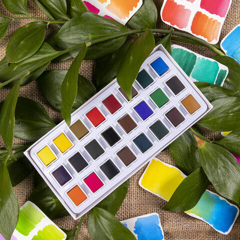 В наборе 24 цвета по 2,5 грамма: лимонная желтая (021), кадмий жёлтый (022),охра жёлтая (029), кадмий красный (014), амарант (006), красно-коричневая (012), нефритовая зелёная (064), церулеум (036), прусская синяя (031), кобальт зелёный (061), сепия (085), чёрная (051), умбра жжёная (084), сине-фиолетовая (073), зелёная светлая (062), фиолетовая (071), хром оранжевый (026), пурпурная (007), индиго (076), сиена жжёная (082), прусская зелёная (065), оливковая (069), красная тёмная (001), неаполитанская жёлтая (127). |