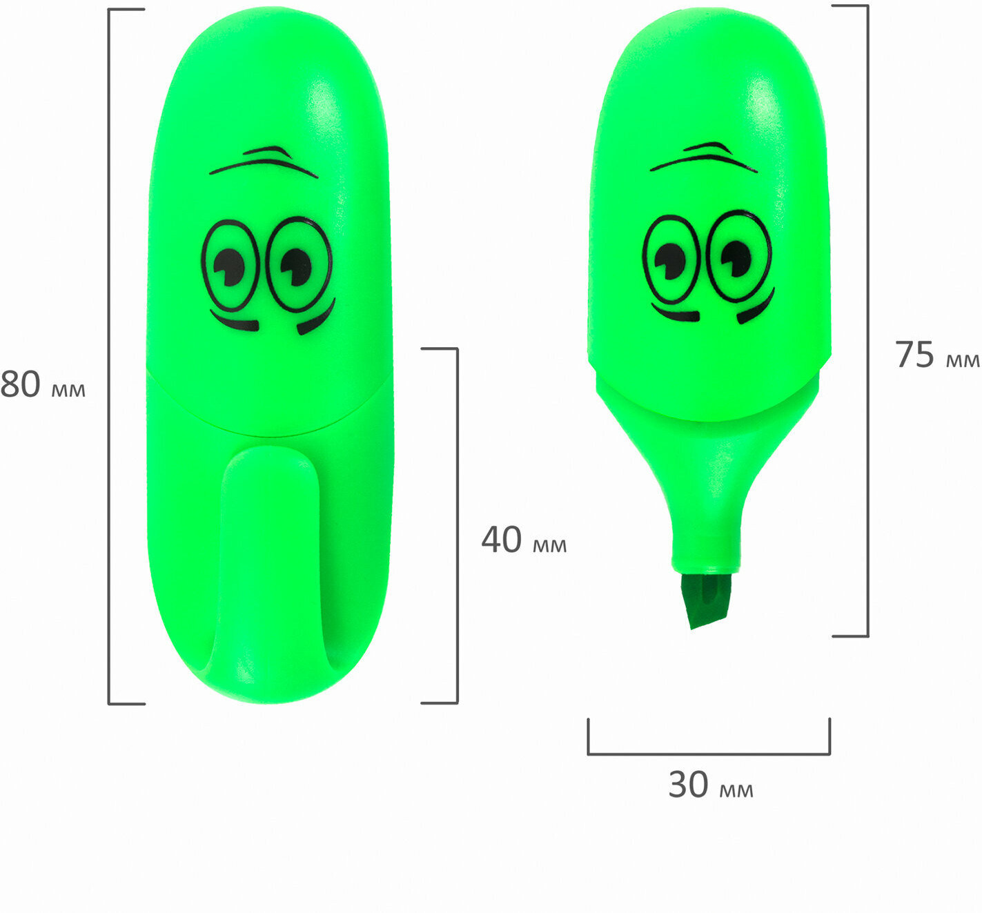 Овальная форма корпуса, диаметр которого 30 мм. Скошенный наконечник имеет толщину линии письма от 1 до 5 мм, что обеспечивает удобство при работе с текстом, напечатанным мелким шрифтом, или таблицами. Благодаря особой водной основе чернил текстовыделитель не высыхает без колпачка в течение 8 часов. Текстовыделитель обладает экономным расходом чернил, при этом длина линии письма достигает 300 метров. Чернила быстро впитываются и тем самым предотвращают размазывание в процессе использования. Цвет колпачка и корпуса текстовыделителя соответствует цвету чернил.