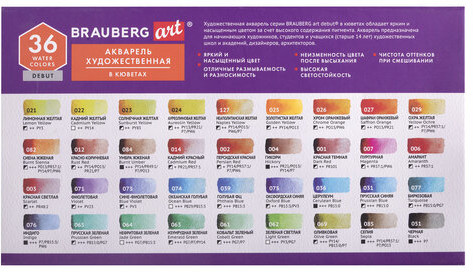 Серия: Debut Акварельные краски профессионального качества созданы из высококачественных пигментов и гуммиарабика, без добавления примесей, что обеспечивает чистоту и насыщенность каждого цвета, а также получаемых при смешивании оттенков. Краски обладают отличной размываемостью и разносимостью, сохраняют оттенки после высыхания, высокоустойчивы к воздействию солнечного света.