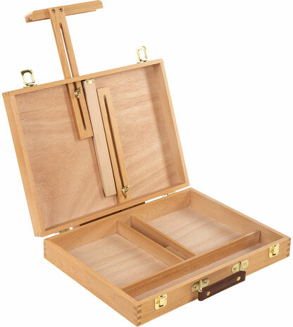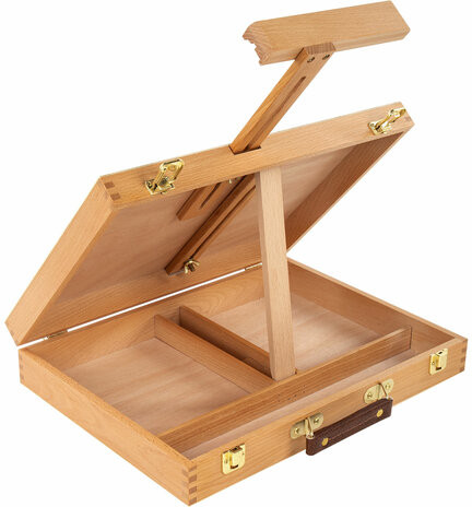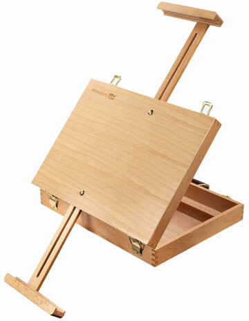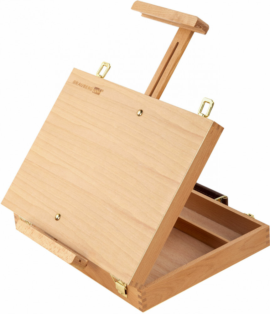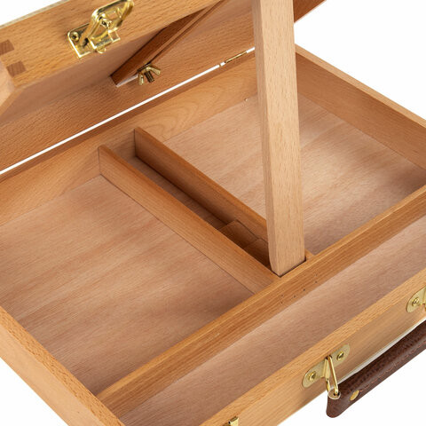 Настольный этюдник-мольберт снабжен специальным ящиком для художественных принадлежностей. Угол наклона и высота мачты регулируется. Оснащен удобной ручкой. Этюдник-мольберт изготовлен из натурального бука, пропитанного маслом.